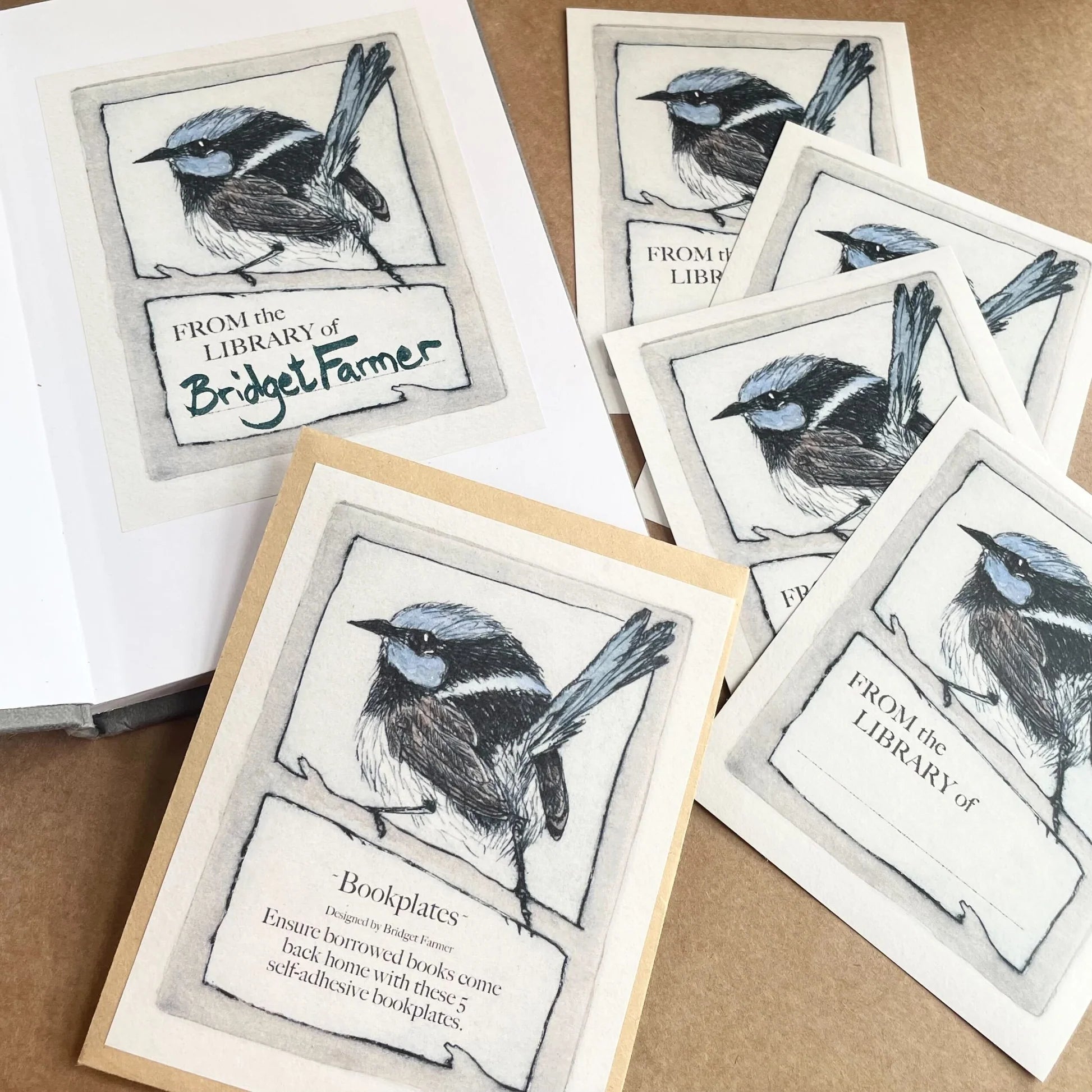 This bookplate set consists of 5 adhesive plates. The images for these bookplates are from an original etching of the beautiful male superb fairywren.