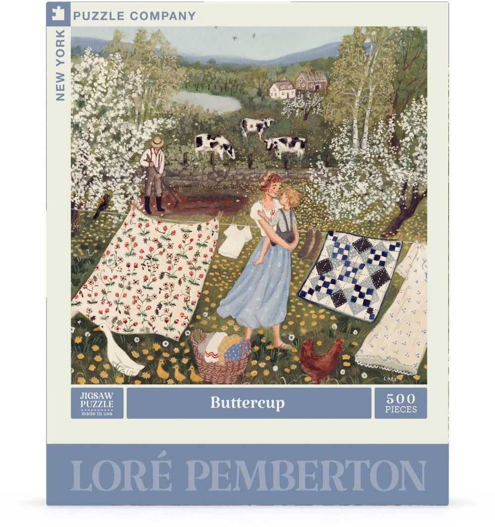 Buttercups cover the ground as a mother takes a break from hanging laundry to share a tender moment with her young child. A farmer plots land for planting and cows leisurely eat away at the grass.