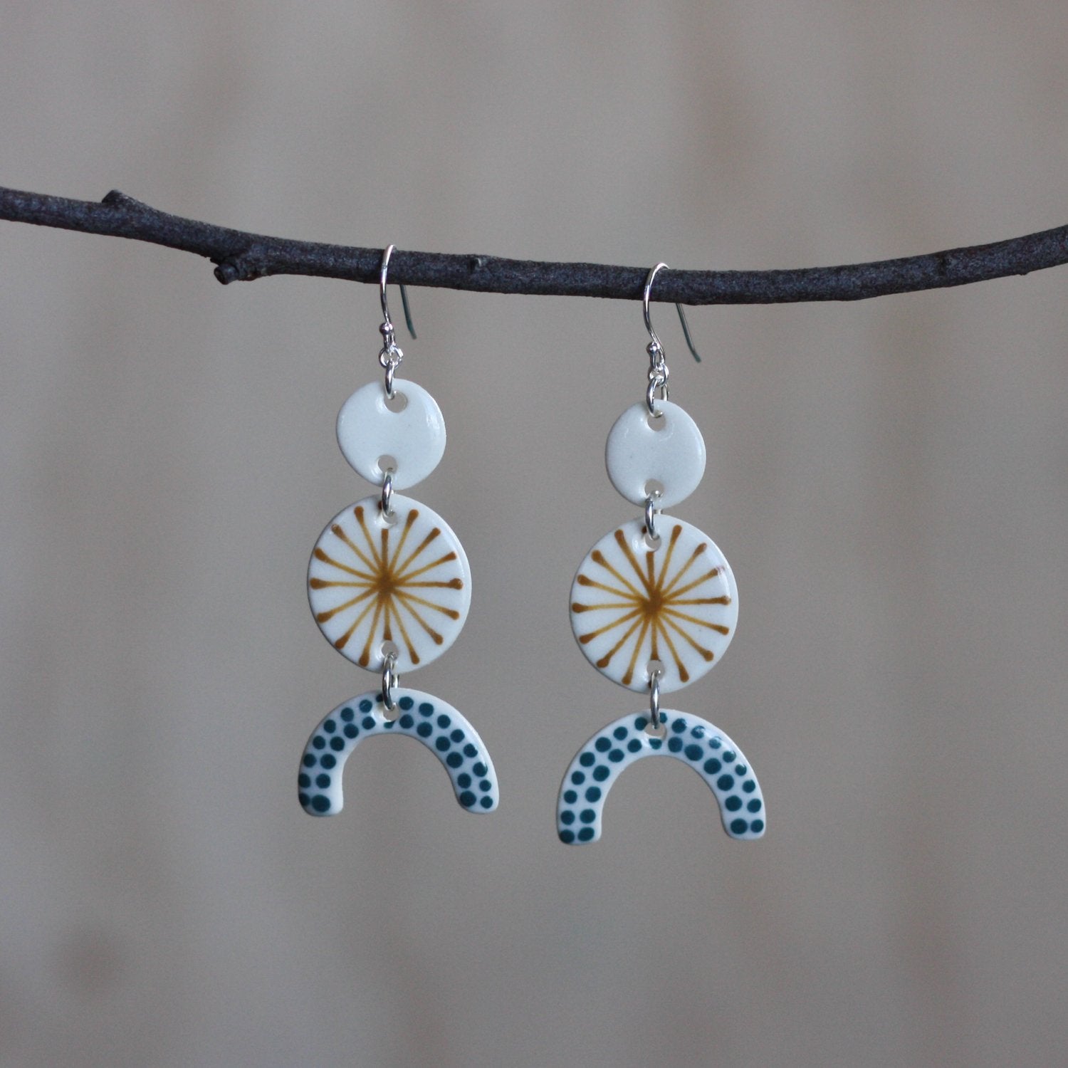 Lovingly handmade in Tasmania by Cara Edwards, these earrings measure 6.5cm long from the top of the silver hook to the bottom of the last ceramic piece. The widest ceramic piece measures 2.5cm.