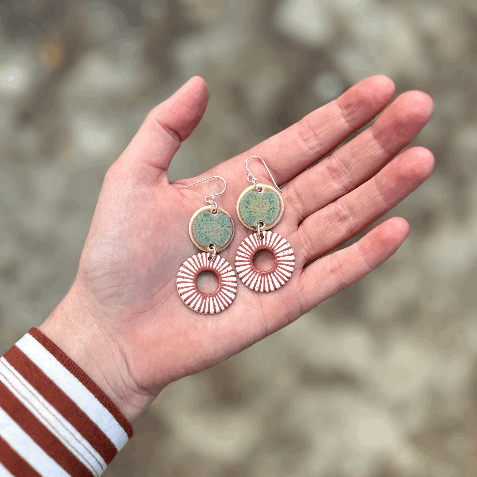 These earrings measure 6cm long from the top of the silver hook to the bottom of the last ceramic piece. The widest ceramic piece measures 2.5cm.