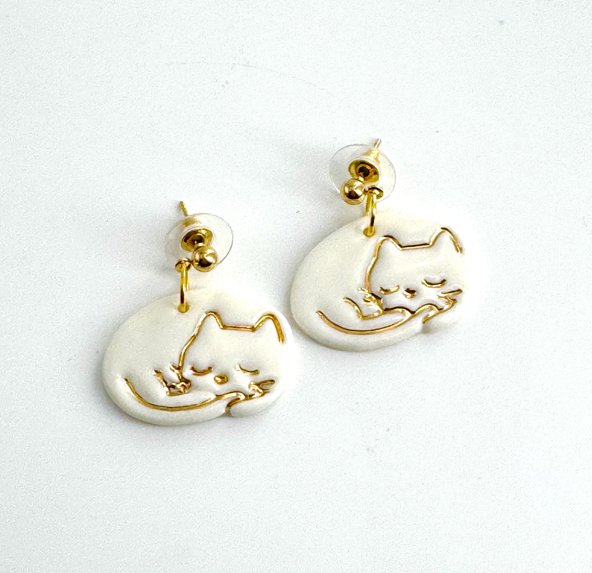 These sweet earrings feature a hand painted sleepy cat with gold detail. The ceramic piece measures approximately 3cm x 2cm. Studs are nickel free gold plated.