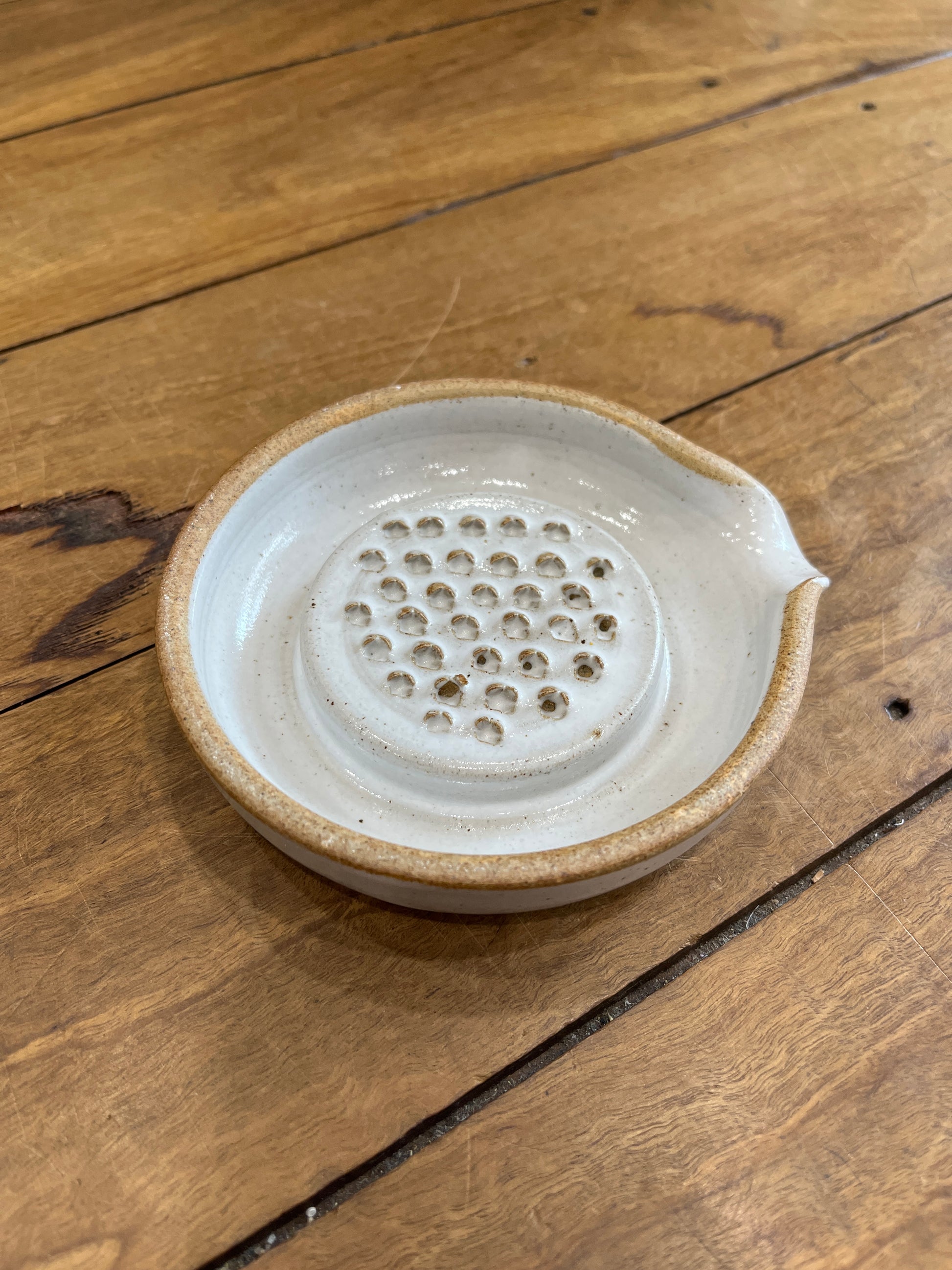 This grater is perfect for ginger or garlic. It’s strong little teeth will easily grate tough ginger and they’re super easy to clean. Glazed in a soft, neutral speckled white with a slightly rustic finish. Please note, each dish is handmade and the style and glaze will vary lightly to the image here.