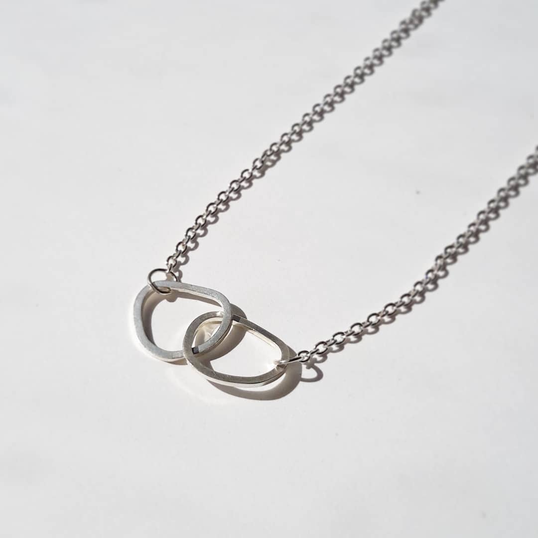 Two intertwined recycled sterling silver organic loops. Continuous and Infinite. Handmade with a matte silver finish. Comes securely attached to a 45cm sterling silver cable chain. Approximate measurement of loops, length 1.4cm width 3cm.