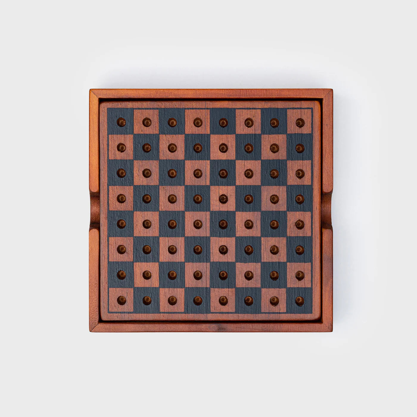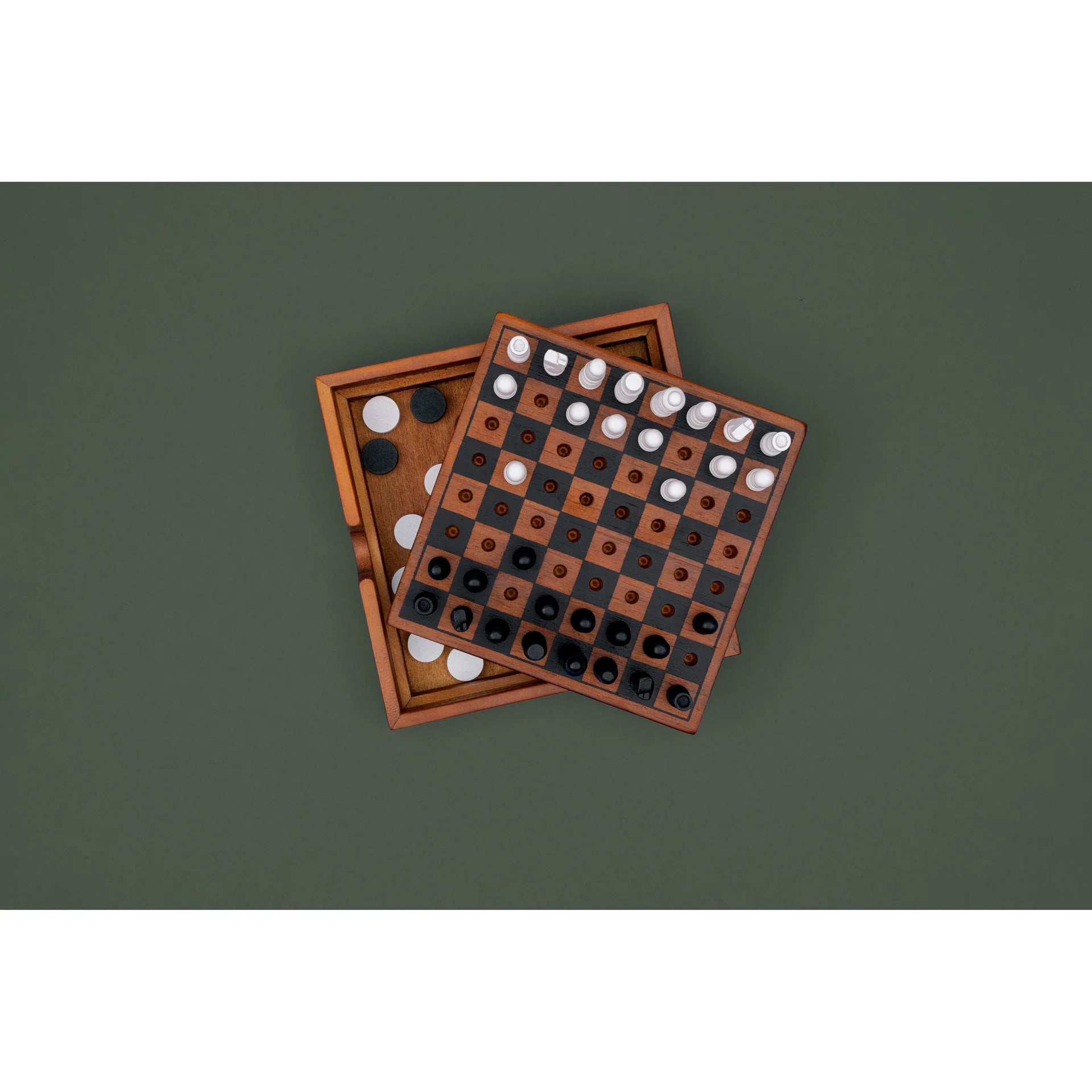 The wooden board game set includes both chess and checker pieces, neatly organized in a smart all-in-one box design. The lid even serves as the playing board, making it easy to take this game on the go.
