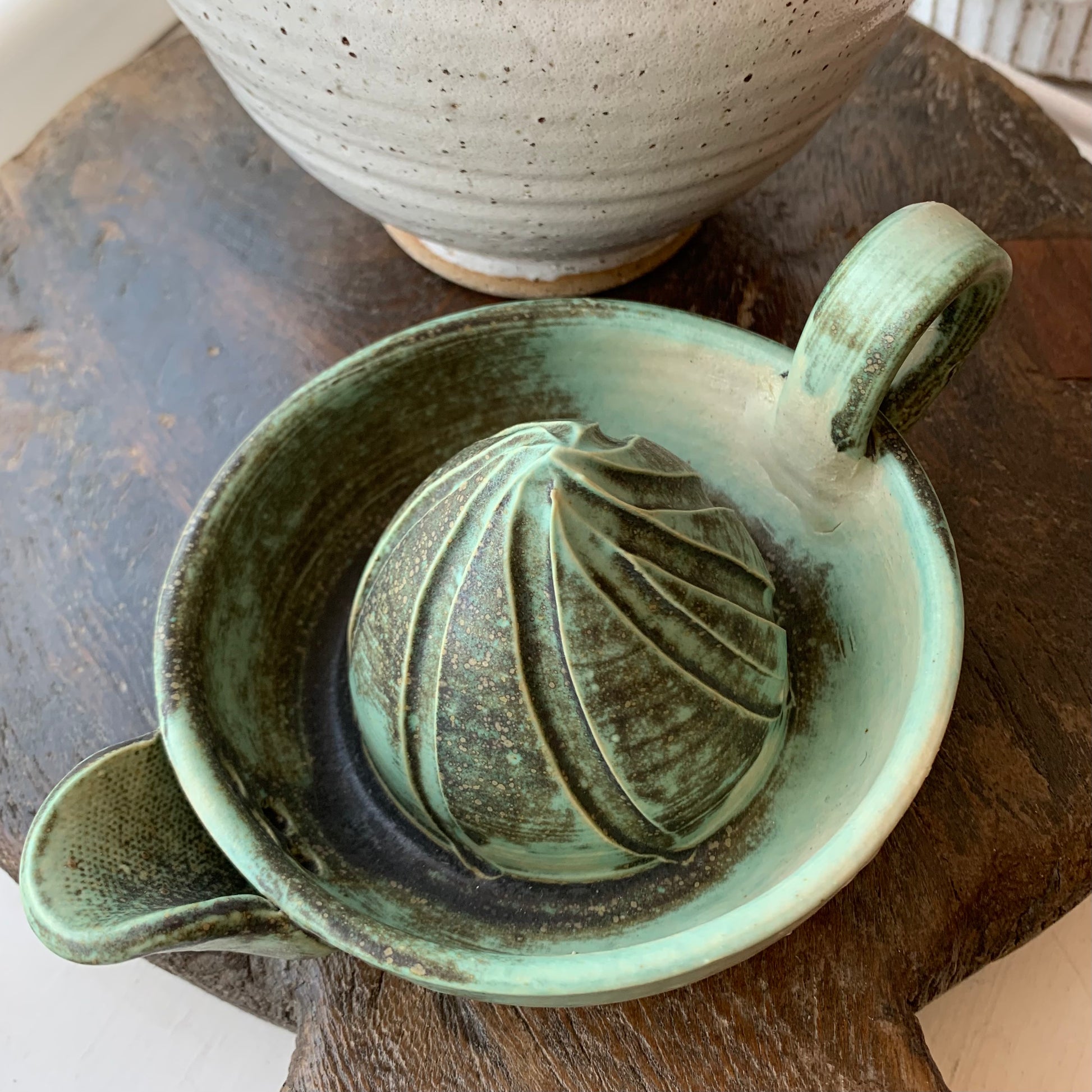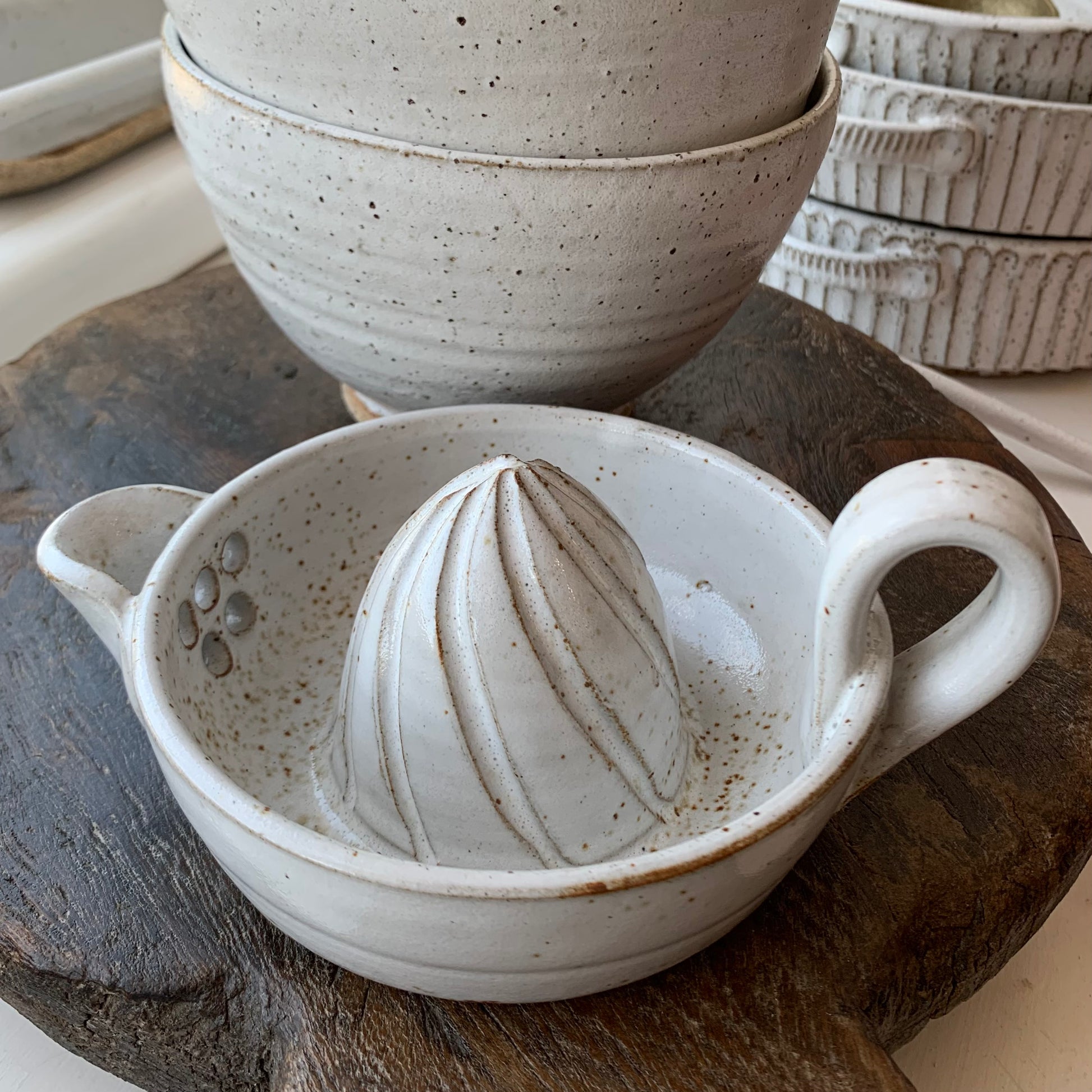This citrus juicer is wheel thrown and then hand carved to create the juicing grooves. Includes straining holes for and quick and easy everyday juicer. Satisfyingly weighty, the design makes it easy to get your daily dose of vitamin C.