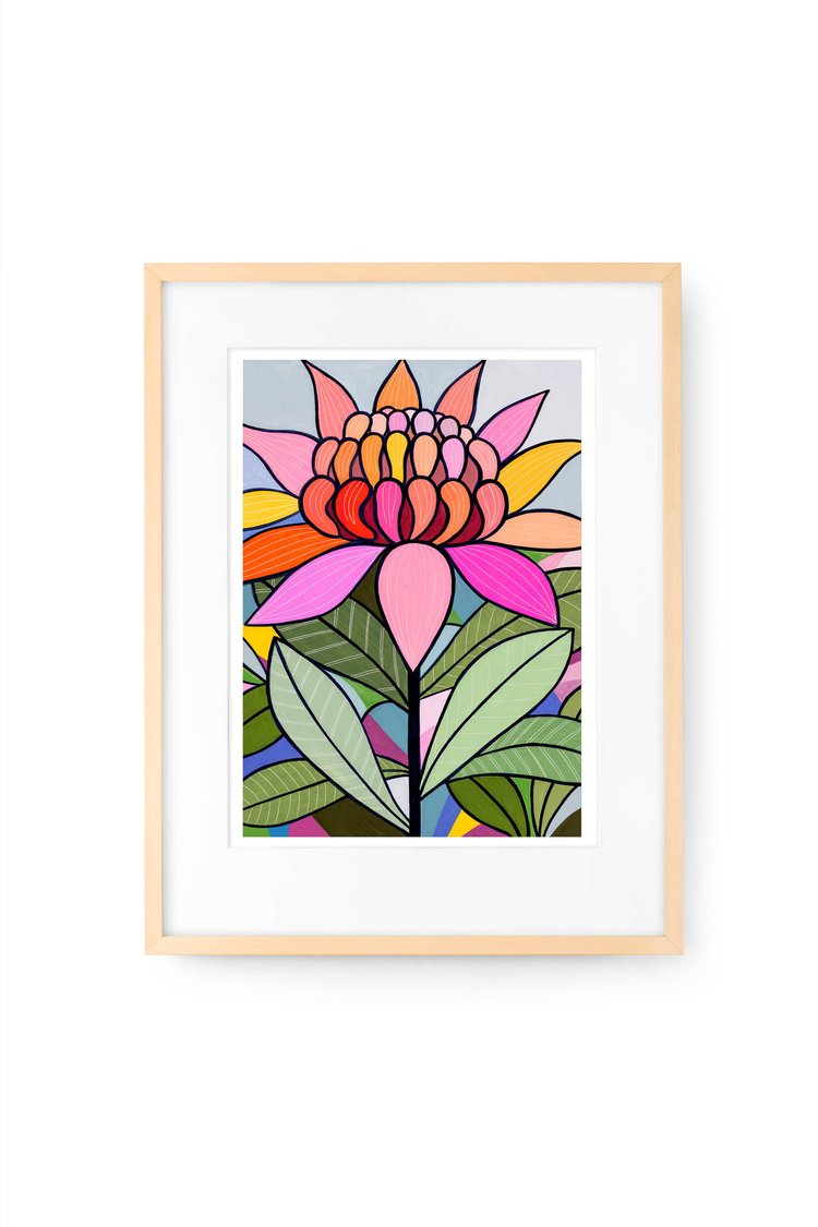 A vibrant and colourful print featuring the Australian Waratah flower in bright pink hues with cool green leaves