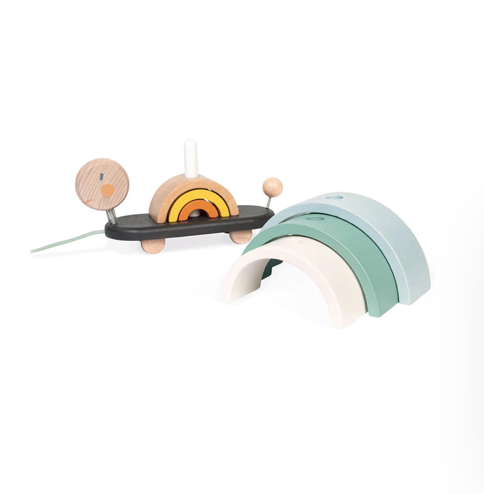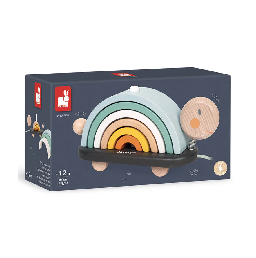 This wooden pull along toy from Janod doubles as a colourful rainbow stacker toy that’s great for open ended play. Stack the rainbow on the turtle’s back to make a shell or use it separately to build towers and bridges.