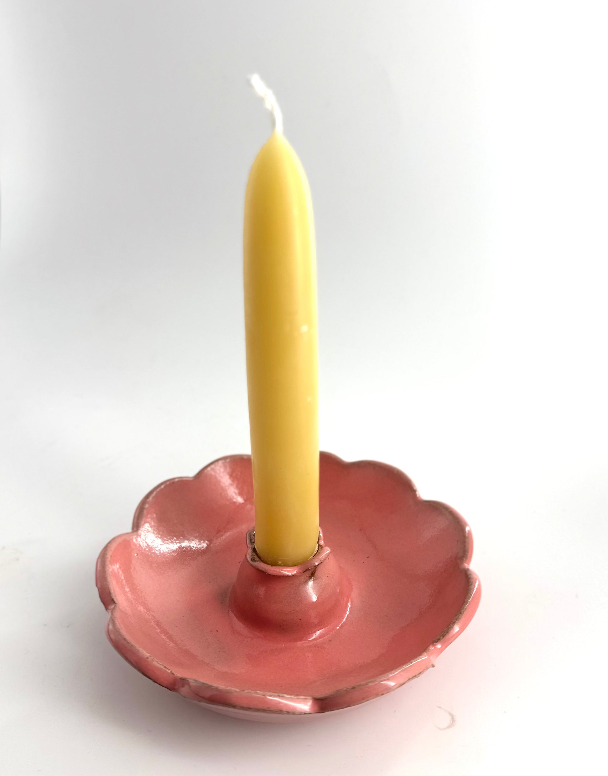 A sweet little scalloped edge candle holder in a glossy deep pink. Holds a standard 21mm tapered candle. Pictured here with our beeswax taper