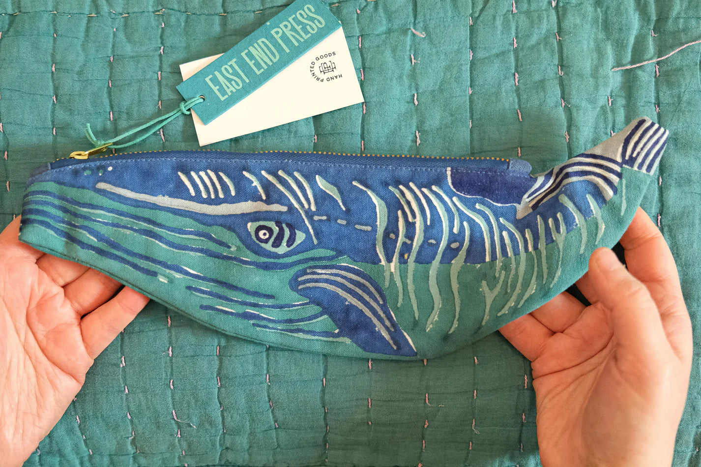 This cheerful pouch is shaped like an alligator and is entirely hand-printed from carved wooden blocks. The pouch has a brass zip and is fully lined with a block printed contrasting pattern.