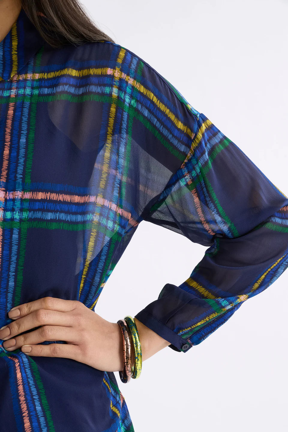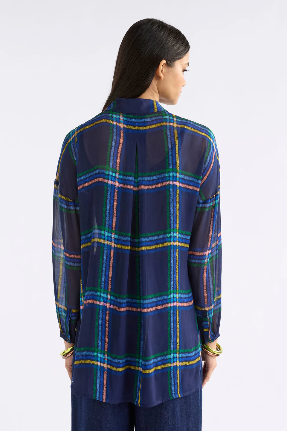 An ELK favourite, the Eir Sheer Shirt now in the classic and striking Elba Check print. Crafted from a lightweight viscose chiffon that has a soft sheerness, silk-like feel and fluid drape as well as breathability. This long sleeve shirt has dropped shoulders and inverted back tuck detail for ease and comfort.