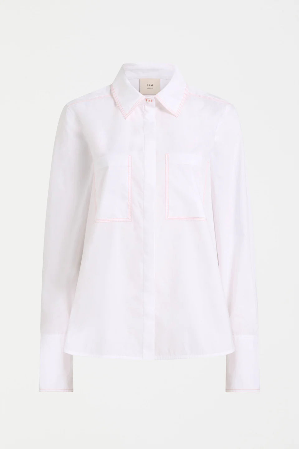 The Salli Shirt features classic collar with contrast top stitching creating a modern twist on shirt detailing. Made from GOTS certified organic cotton poplin with soft, smooth surface and gentle drape. A relaxed fit with slightly dropped shoulders and concealed button-through placket. Finished with patch pockets at chest and high-low hemline with curved side splits. Full-length sleeves with elongated buttoned cuffs complete this refined styling