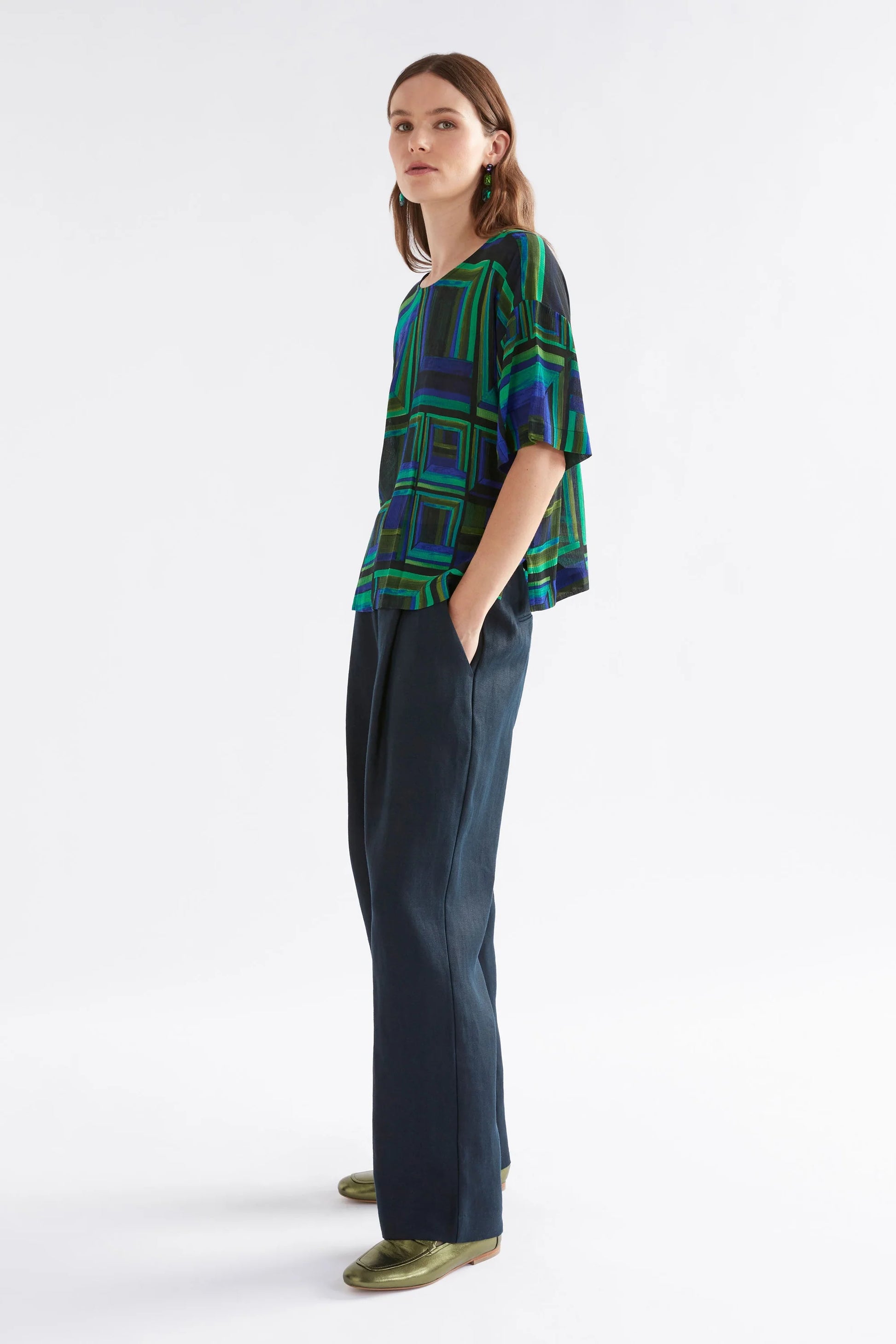 A structured wardrobe hero in a new bold, dynamic print. The Soma Top is a slightly sheer top with a dropped shoulder and a boxy sleeve that stops just above the elbow. Slightly cropped in length, it has a round neck and small side seam splits. The fabric has a crinkled texture effect and subtle sheerness that floats over the body with a soft drape. Offered in the Salone Print - a cool-toned, geometric design featuring hues of green and blue.