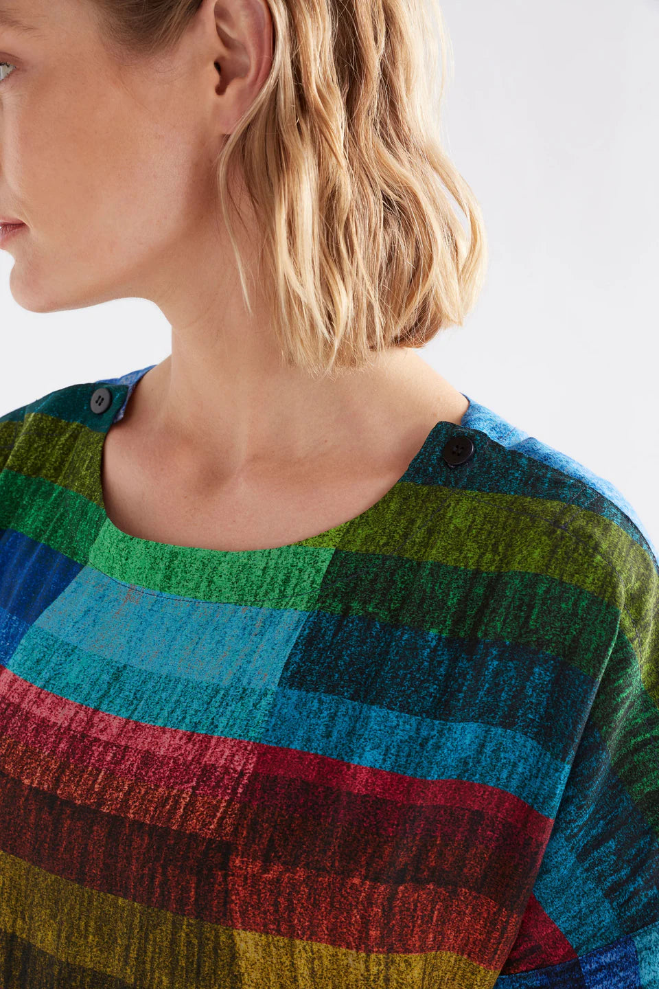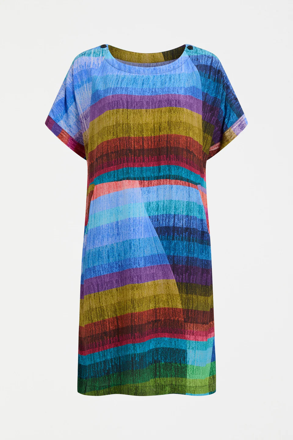 The Sono Dress is a classic, short shift style tee dress in the vibrant multi coloured Komi Print. This easy-to-wear, slip-on, regular fit, day dress features two angled front pockets and round neck with functional button detail on the sides. Crafted from a super soft, lightweight ECOVERO™, an ELK environmentally preferred fibre. Finished with short batwing sleeves, this playful dress will be an easy, to-go addition to your weekend and warm weather wardrobe.