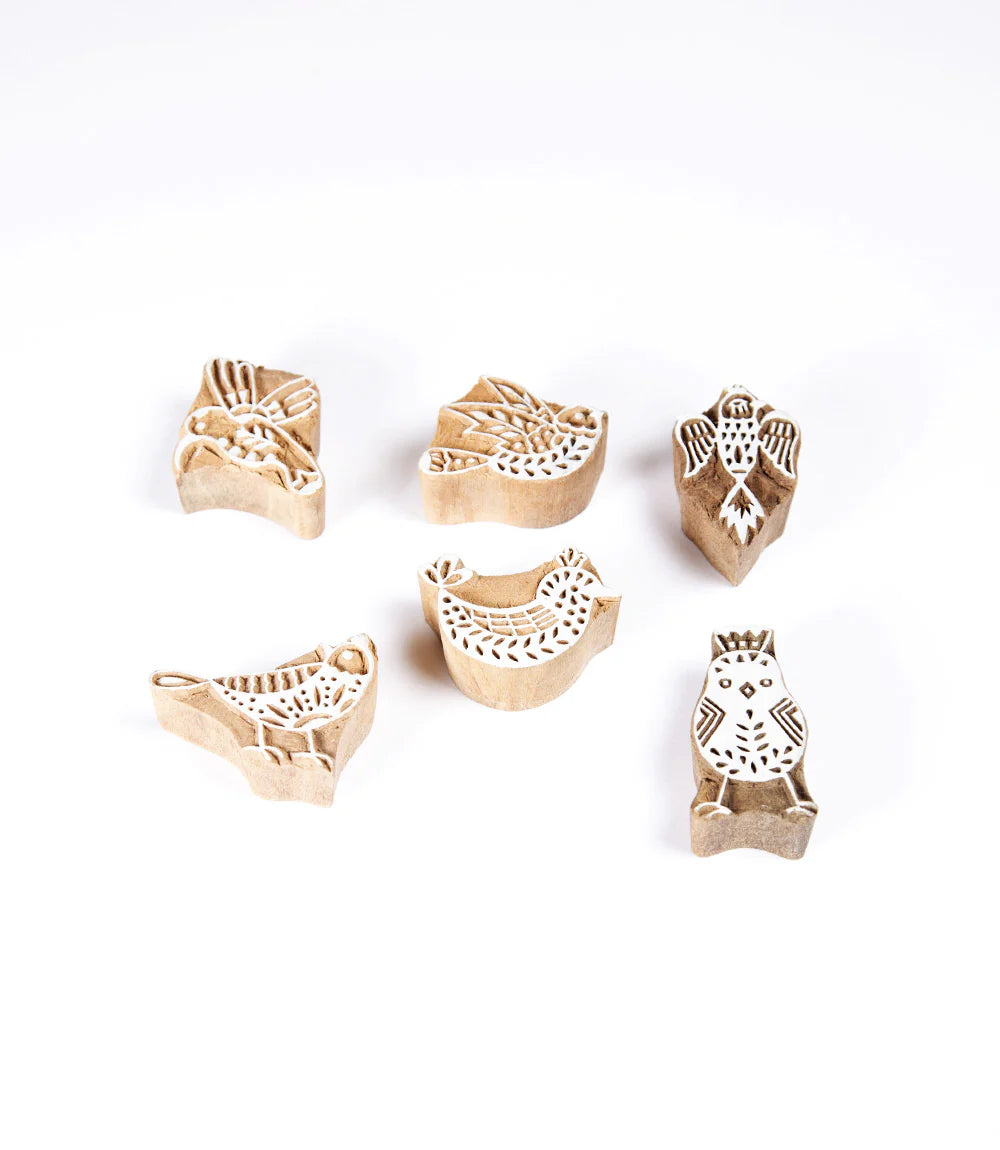Individual hand crafted wooden print blocks in a series of sweet bird motifs.