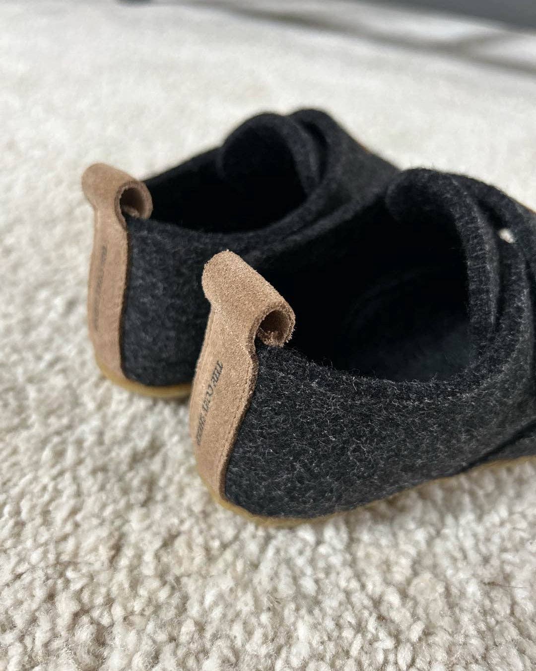 These children's slippers are designed for maximum comfort and quality, made from OEKO-TEX certified wool felt. They are perfect for active children, featuring a very flexible and non-slip crepe sole that ensures a secure grip no matter where they play. Additionally, the slippers are equipped with an adjustable Velcro strap and can open wide, making it easy to get the child's foot in and out. The natural properties of the wool felt make the shoes both temperature-regulating and moisture-wicking, keeping little feet dry and warm all day long.