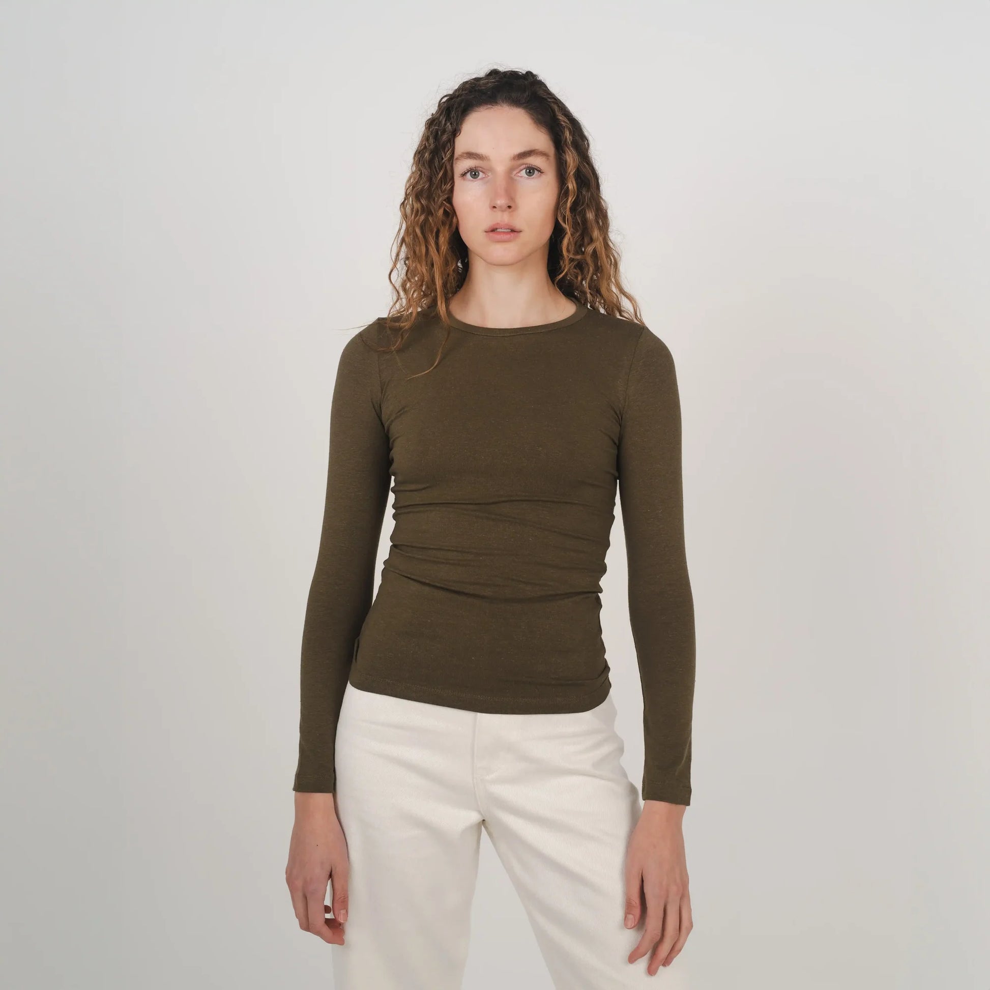 An essential layering piece, this stretch long sleeve top is crafted from breathable hemp and organic cotton with 5% spandex for added stretch and comfort. Featuring a crew neck and long line length, it’s ideal for layering and designed for all day comfort.