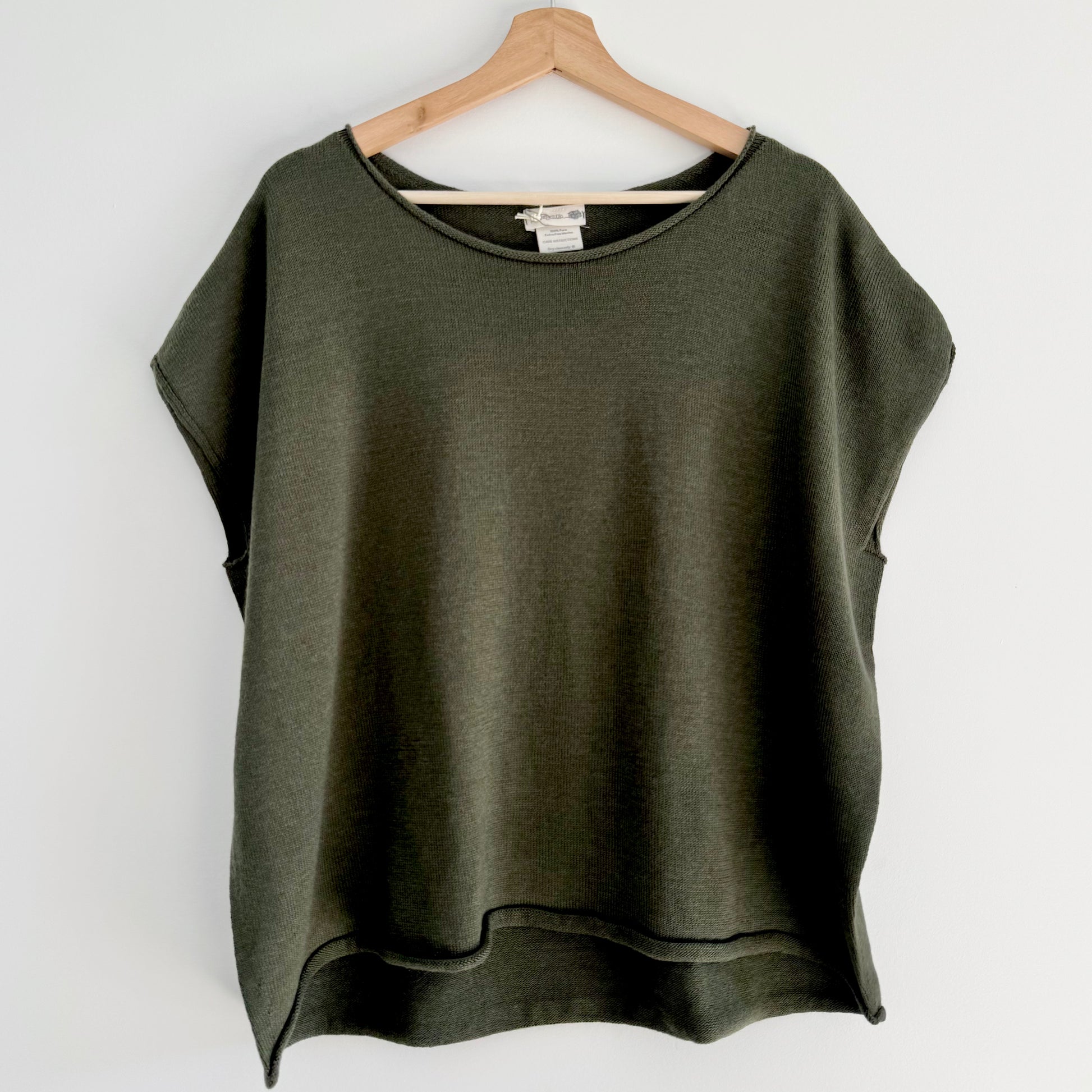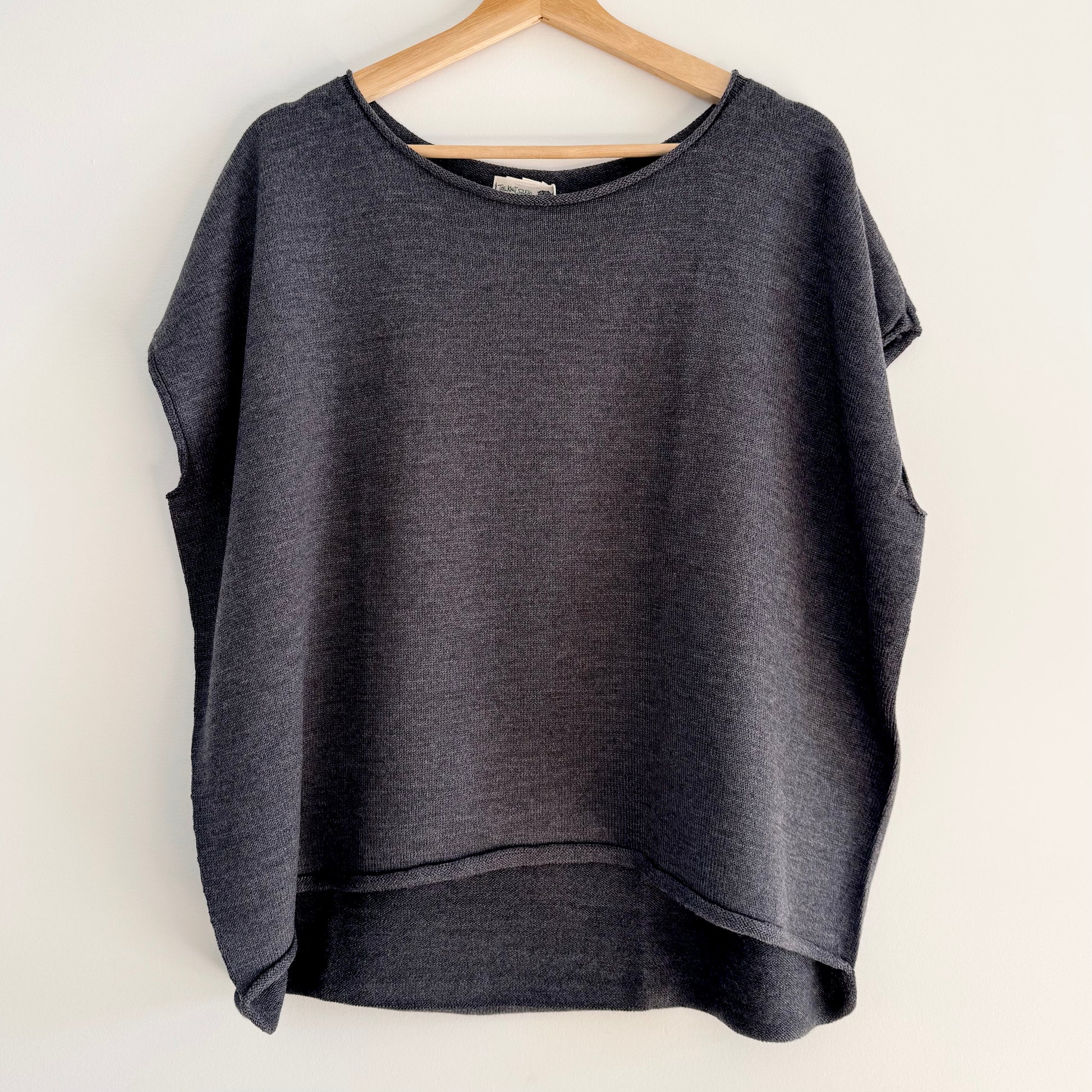 Floating softly, this sleeveless top is a relaxed play on the vest. It drops beautifully over the shoulder to provide a comfortable casual look. Worn with a shirt or simply on its own. A curled edge detail around the neckline and hemline. A trans-seasonal piece taking you through cool winter nights, combined with layers for extra winter warmth.
