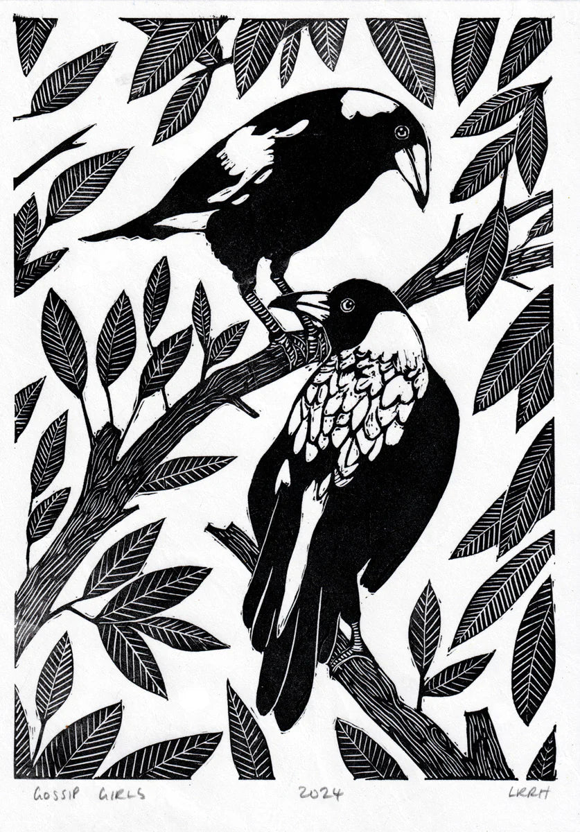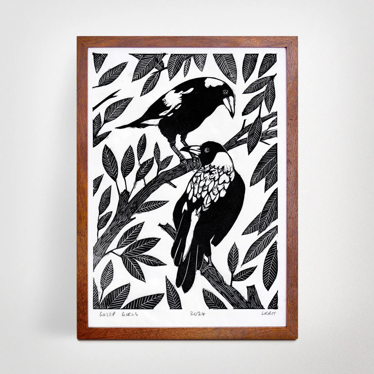 A couple of cheeky magpies in a tree - what are they gossiping about? 'Gossip Girls' is an original linoprint.