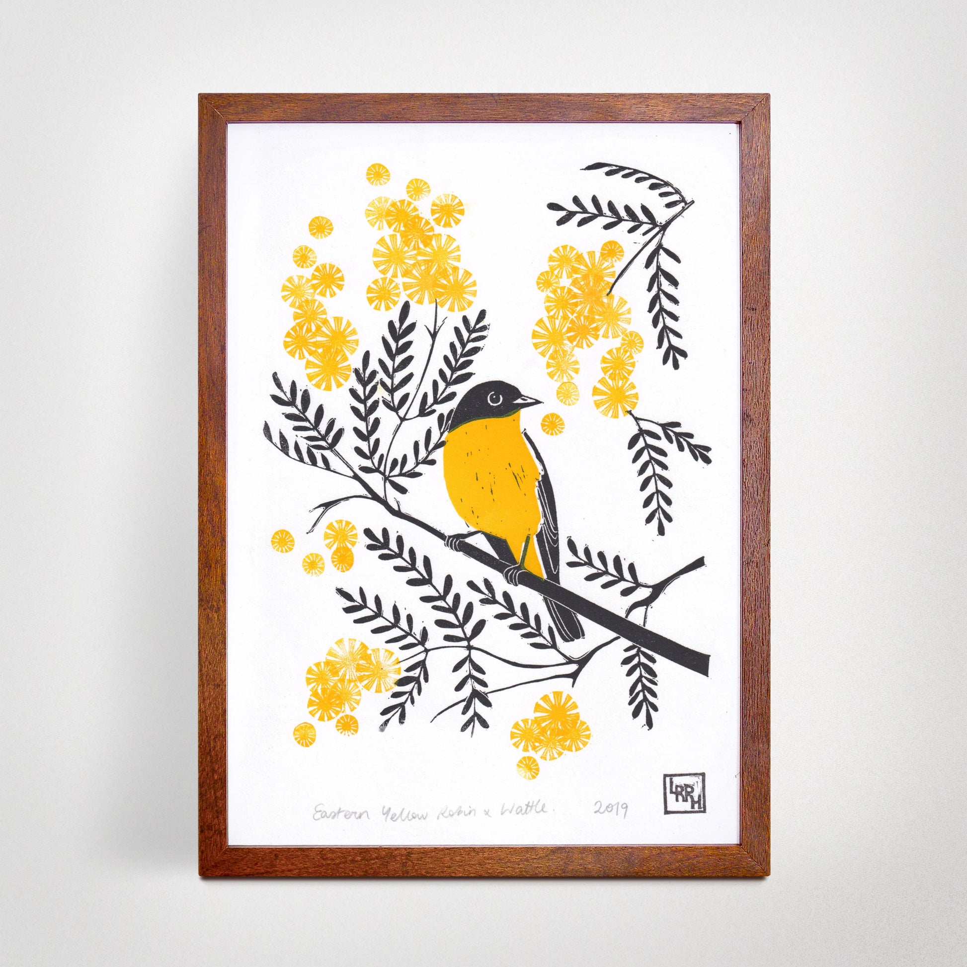 'Eastern Yellow Robin and Wattle' is an original linocut print, inspired by the explosion of yellow blooms that Rowan sees every Spring in Sydney.