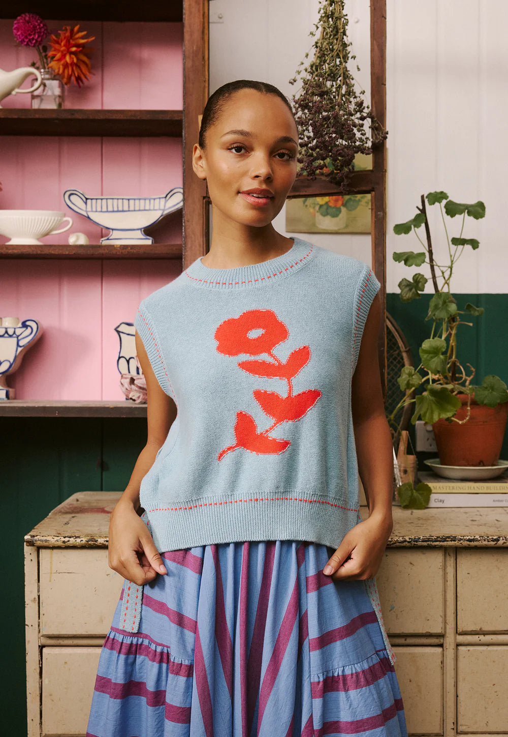 The Cotton Cashmere Aria Vest with fun floral motif - perfect for layering and easy styling.