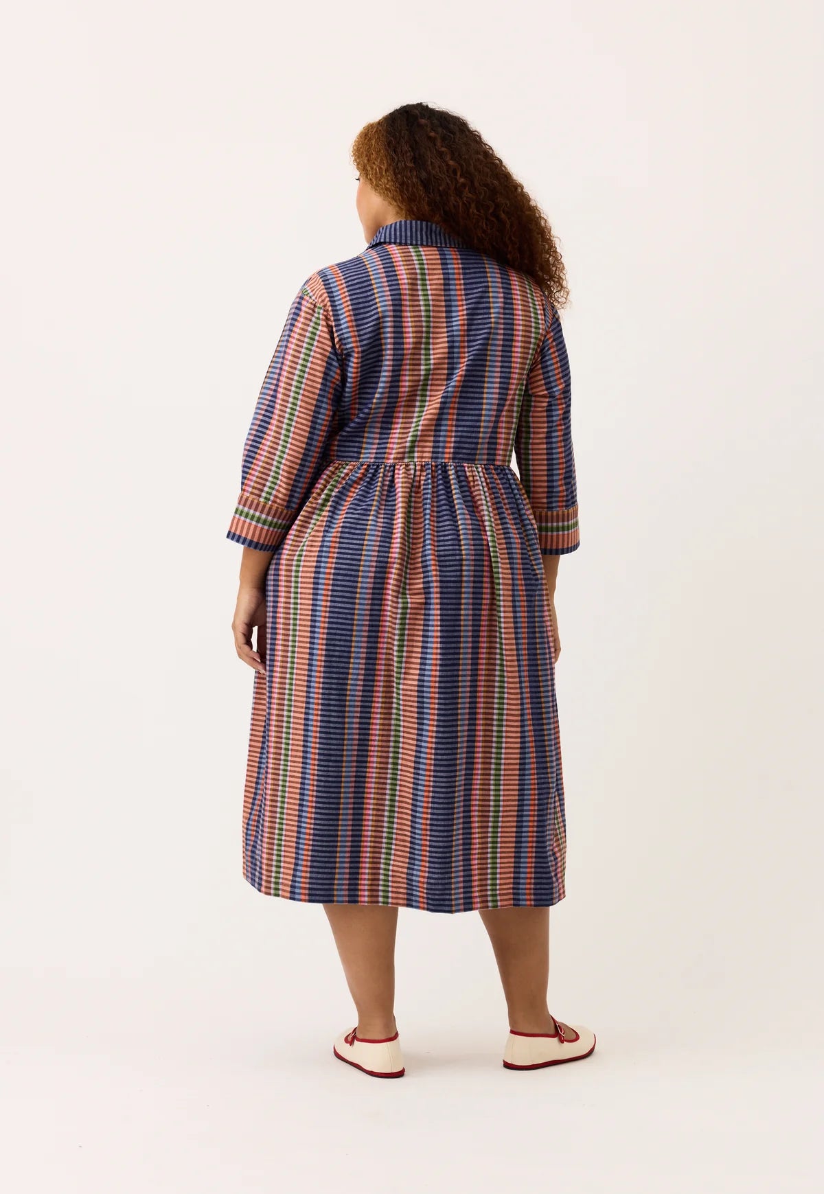 This midi-length dress has a shirt collar, 3/4 length sleeves, drop shoulders, and a gathered waist seam for a relaxed fit.