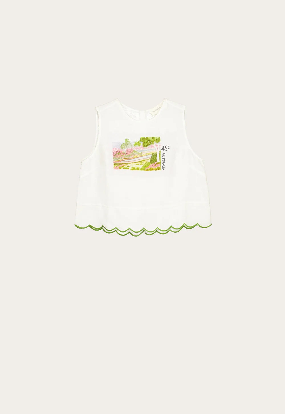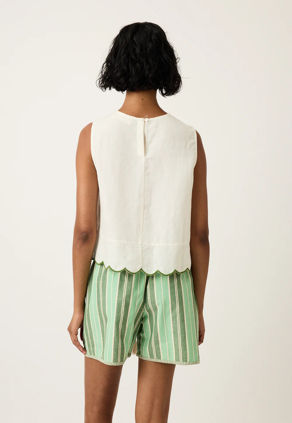 A relaxed crew neck top in cotton linen with scalloped detail at hem.