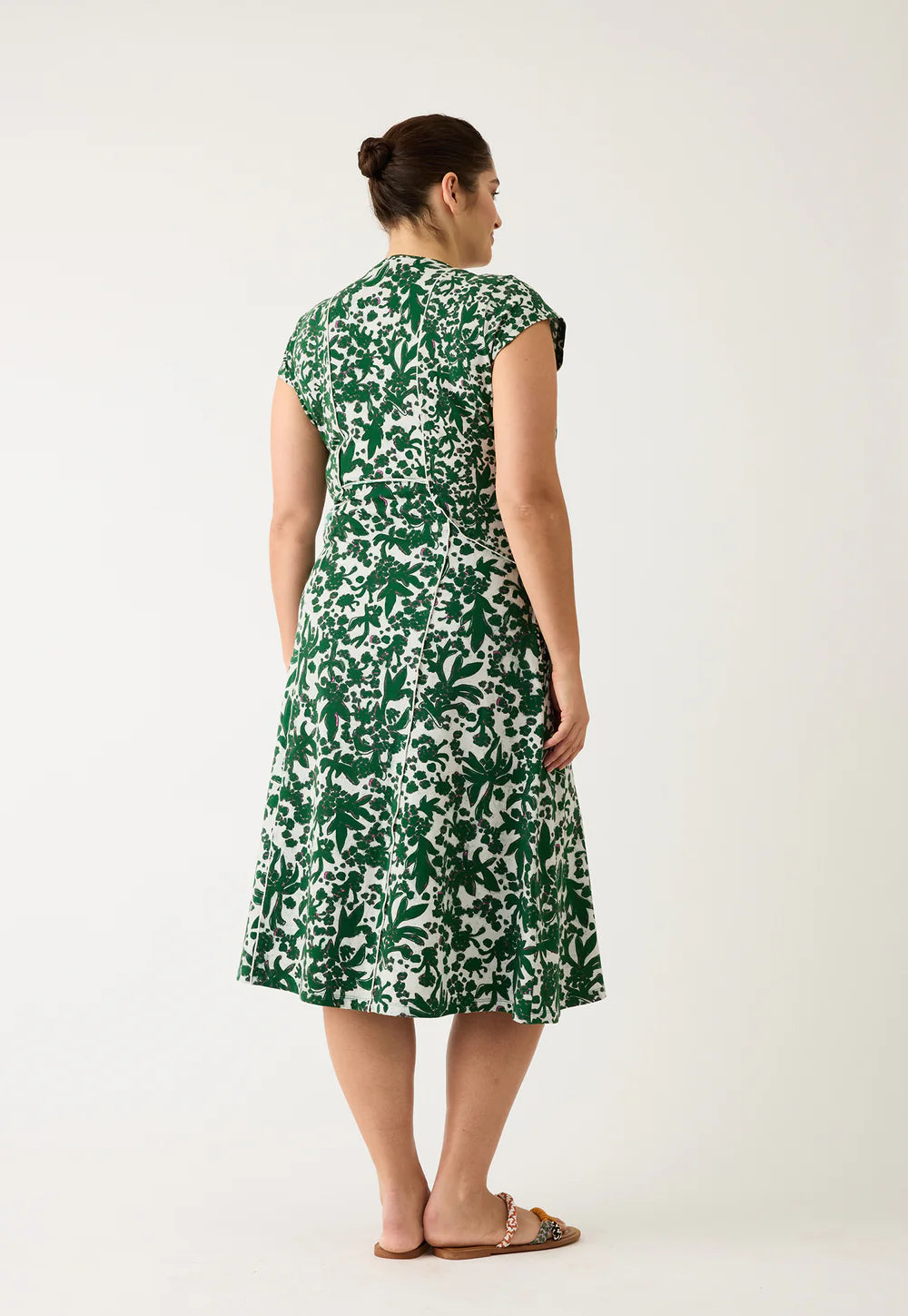 A-line crew neck dress with cap sleeves, featuring a defined waist seam, subtle panelling, detailed piping, and soft ruffling along the bodice and waist. Finished with side seam pockets.