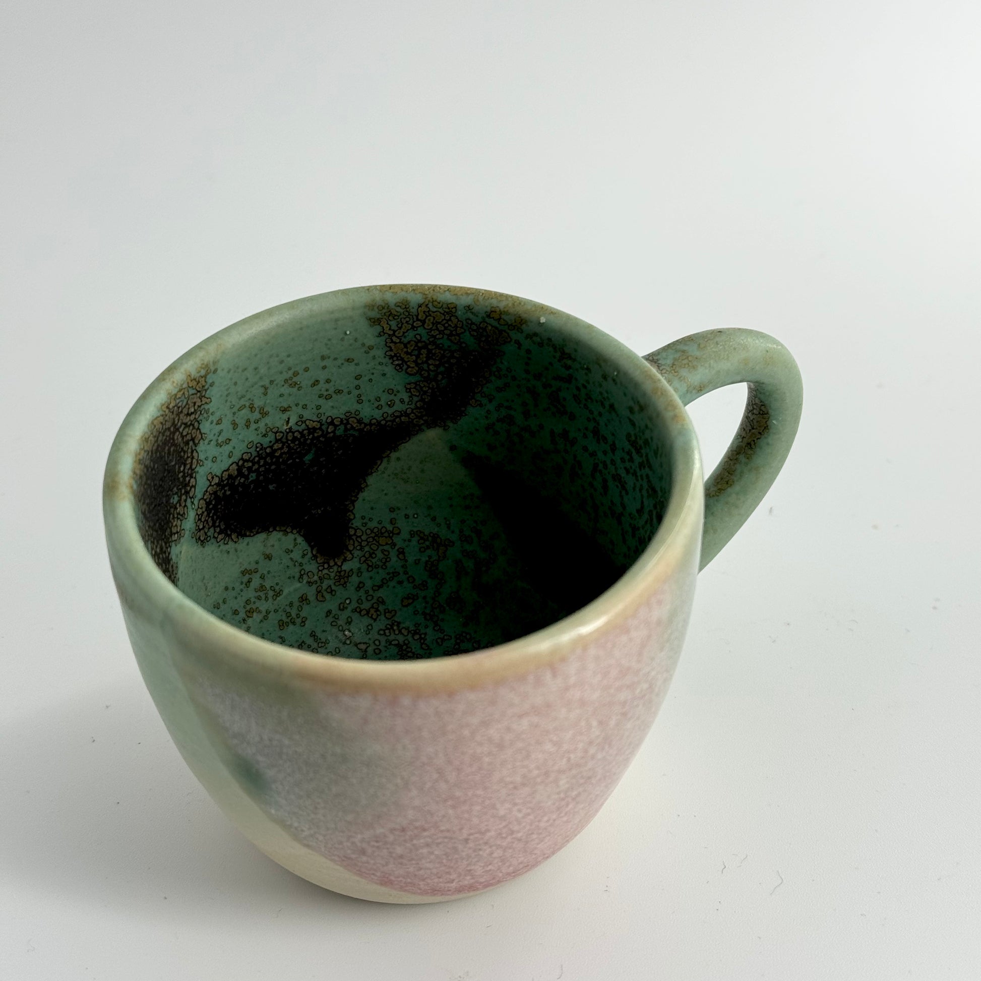A generous sized espresso cup with handle in a beautiful matt green rust glaze with one side dipped in a lustrous pink.