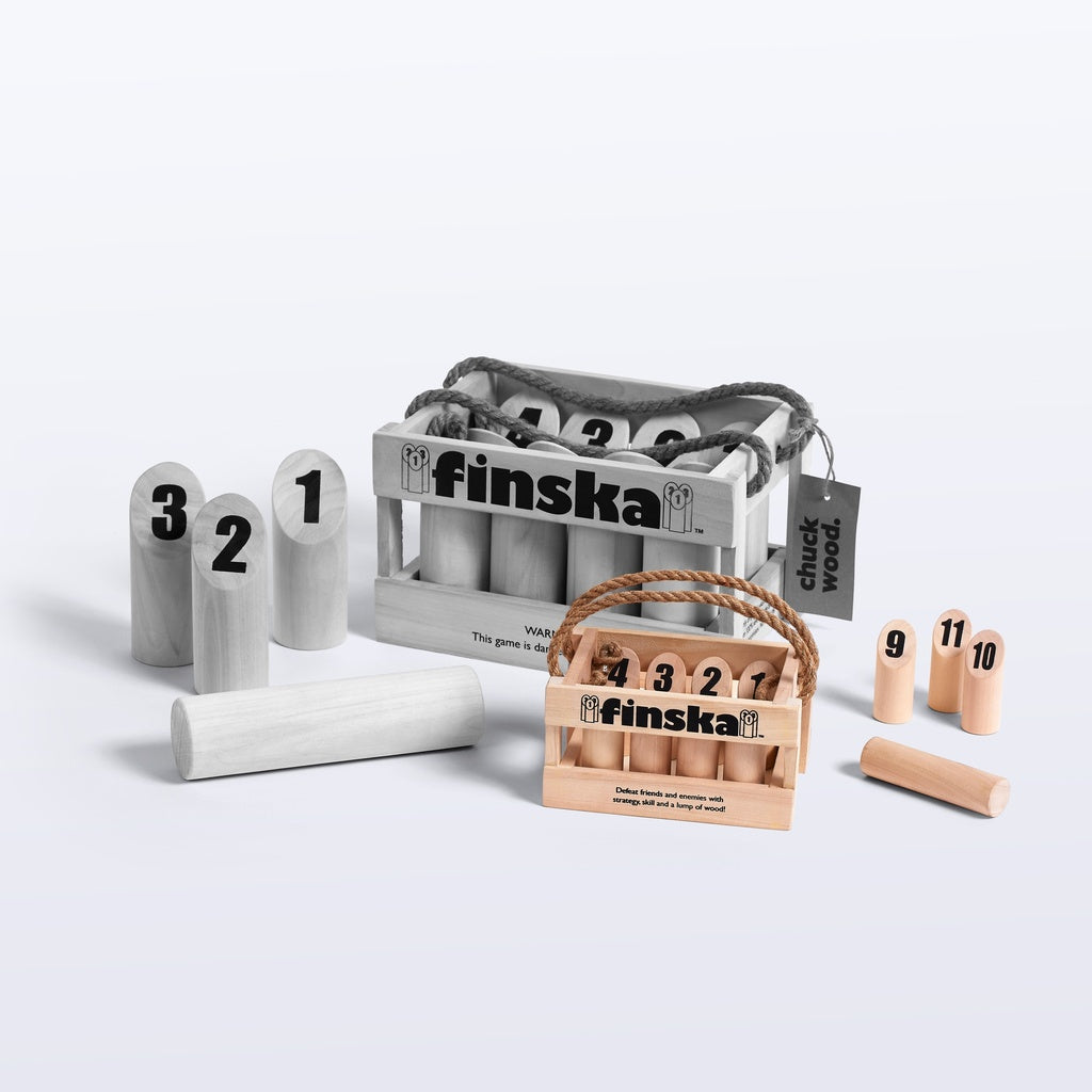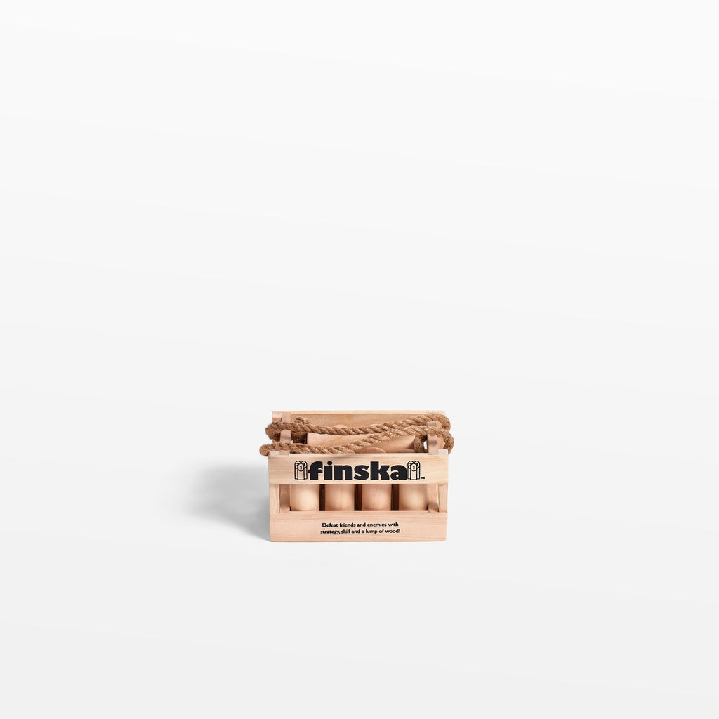 Finska Mini is crafted from eco-friendly birch and comes with everything you need to take your Finska inside! Just like Original Finska, Finska Mini includes birch carry crate, 12 numbered pins, one mini throwing log plus score sheet and rule card.