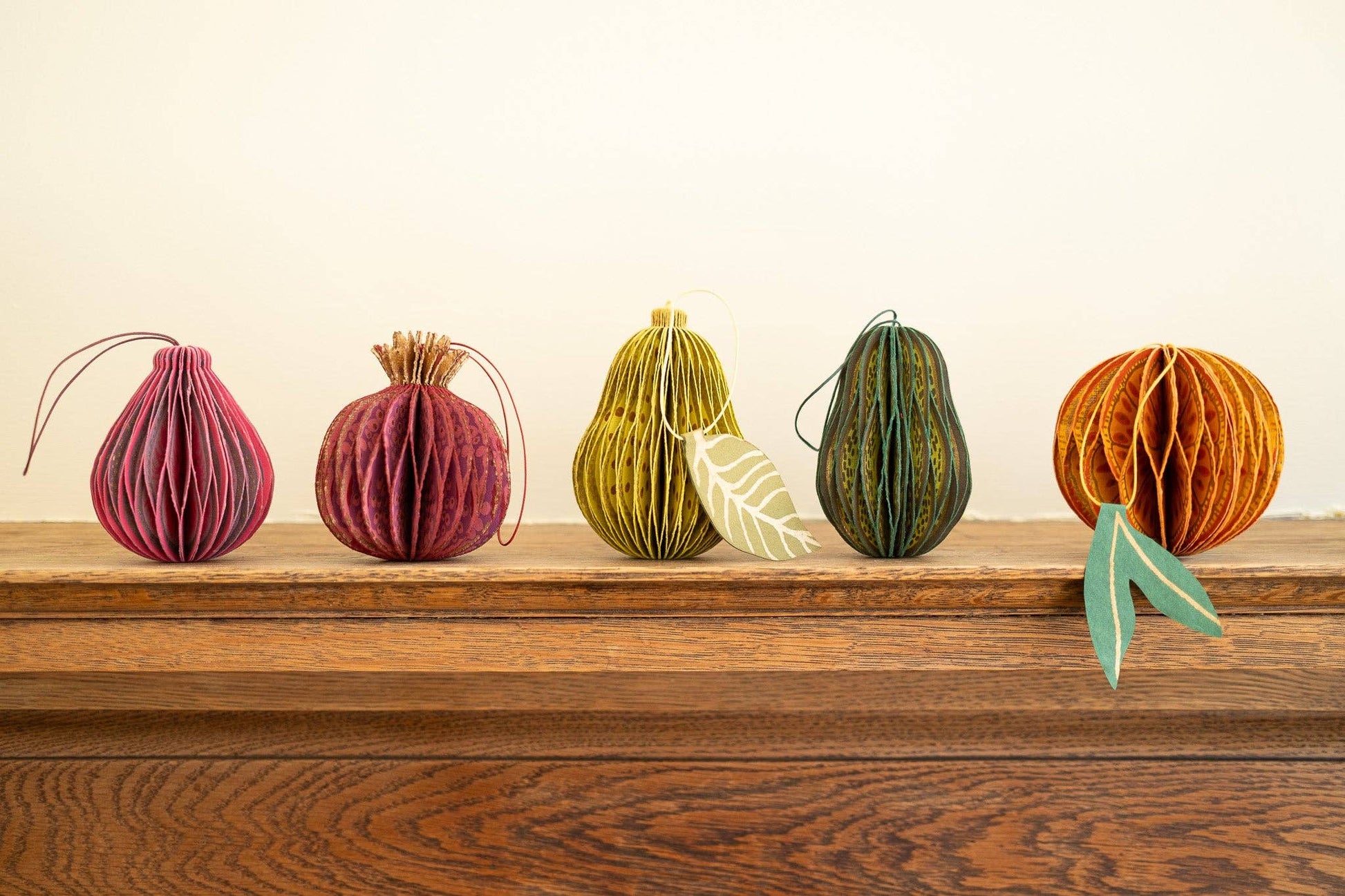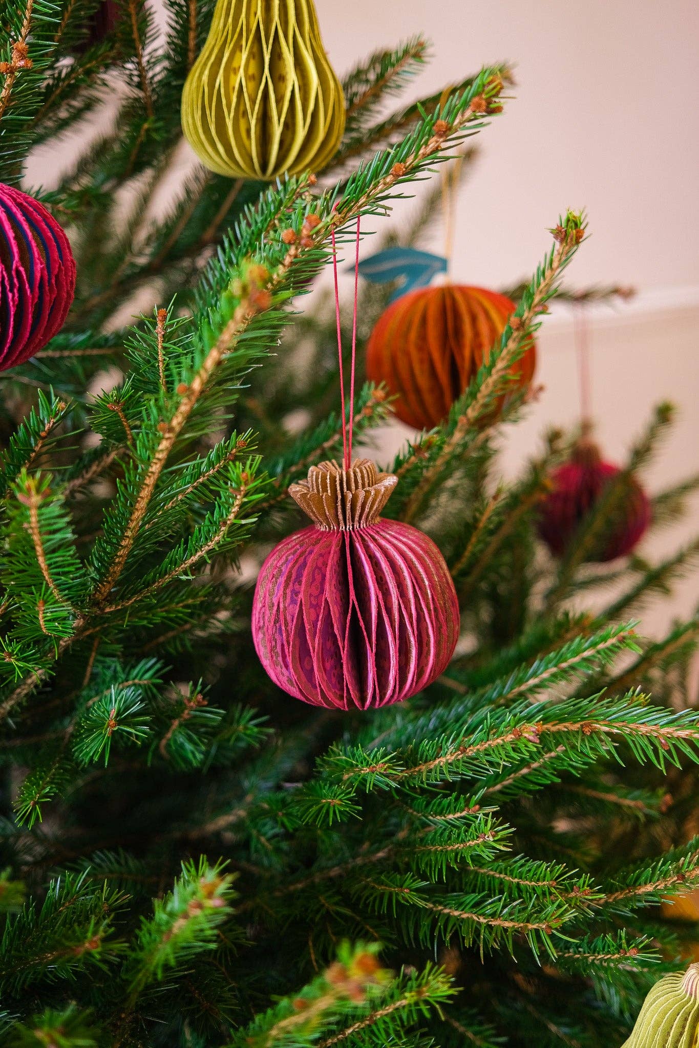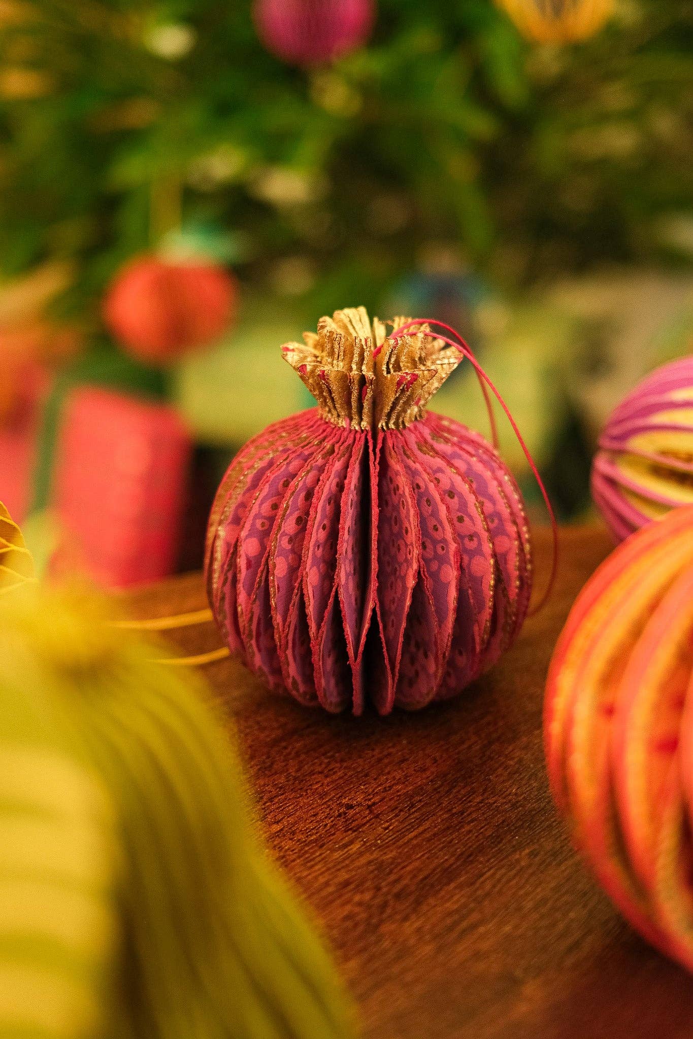 Composed of intricate layers of recycled cotton paper, each decoration unfolds to reveal a three-dimensional pomegranate honeycomb.