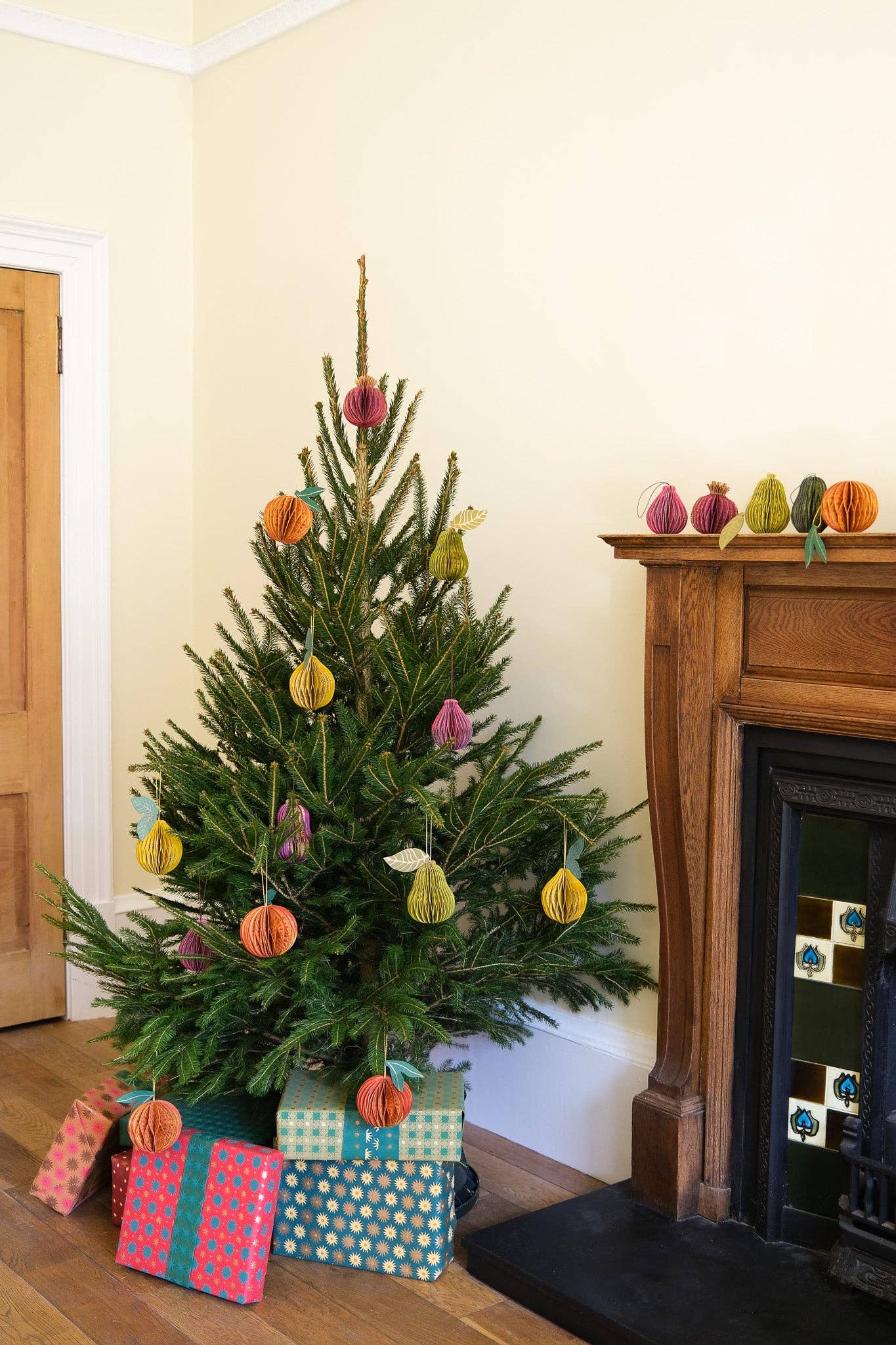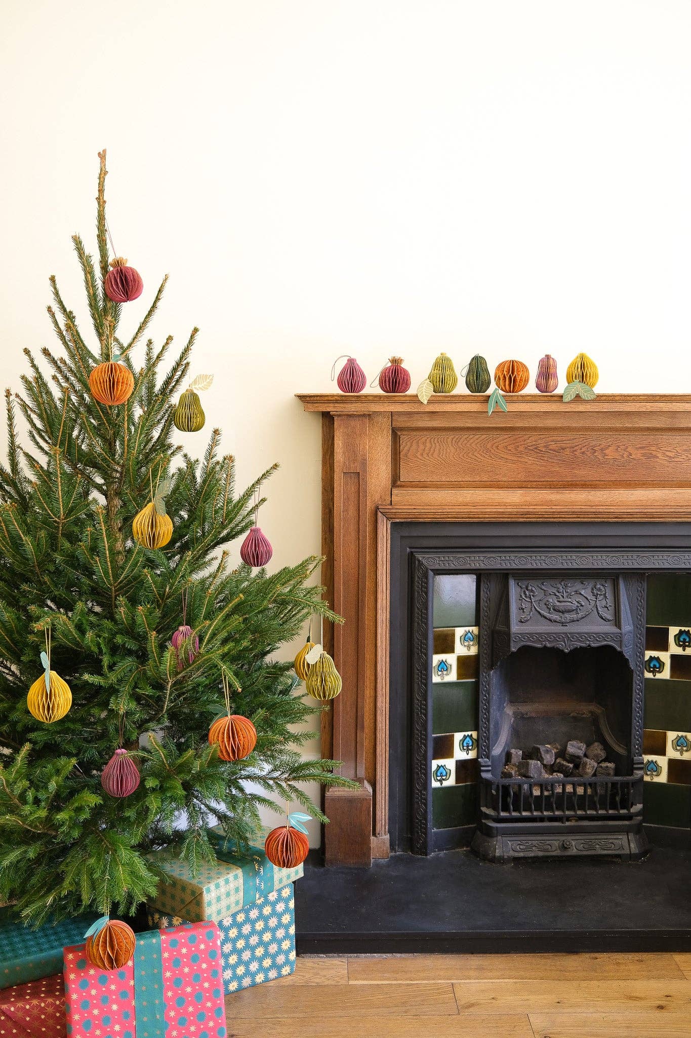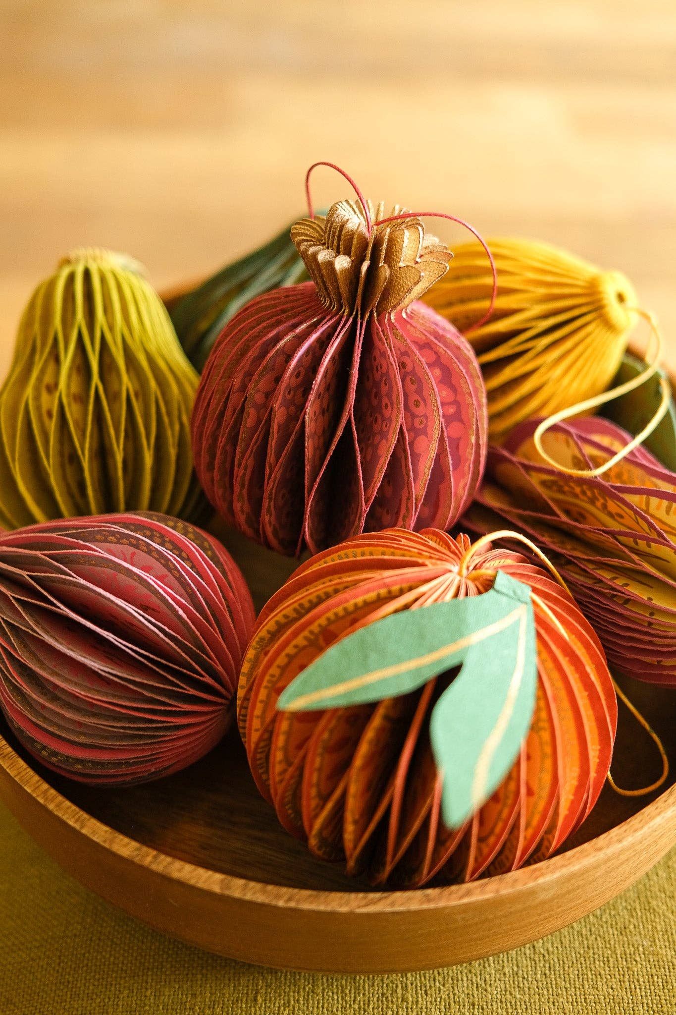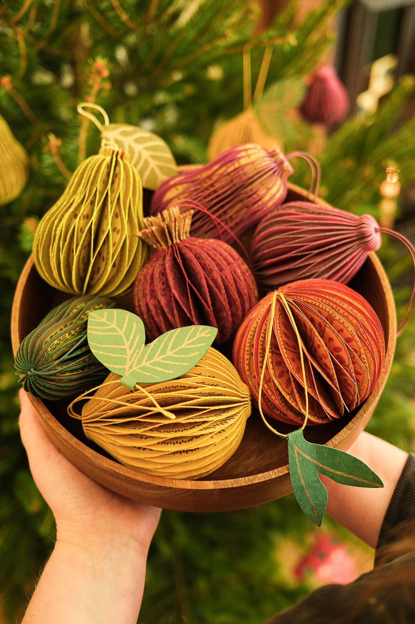 Composed of intricate layers of recycled cotton paper, each decoration unfolds to reveal a three-dimensional pomegranate honeycomb.