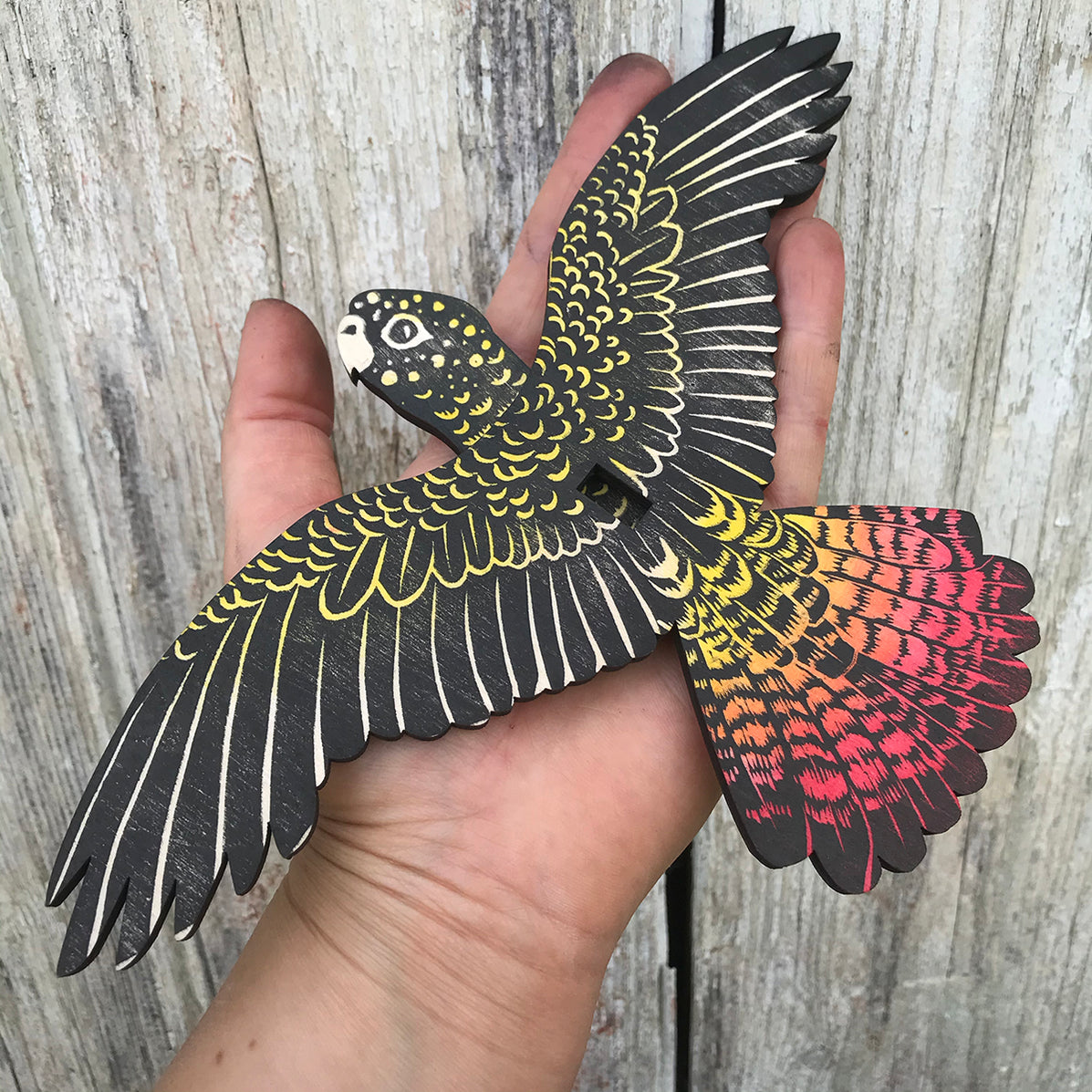 This is a mobile of a Red-tailed Black Cockatoo, or to be more precise a female Red-tailed Black Cockatoo. You can now see the male counterpart HERE. It is made of strong, laser cut, layered plywood and hand printed in multiple layers from hand cut lino plates.