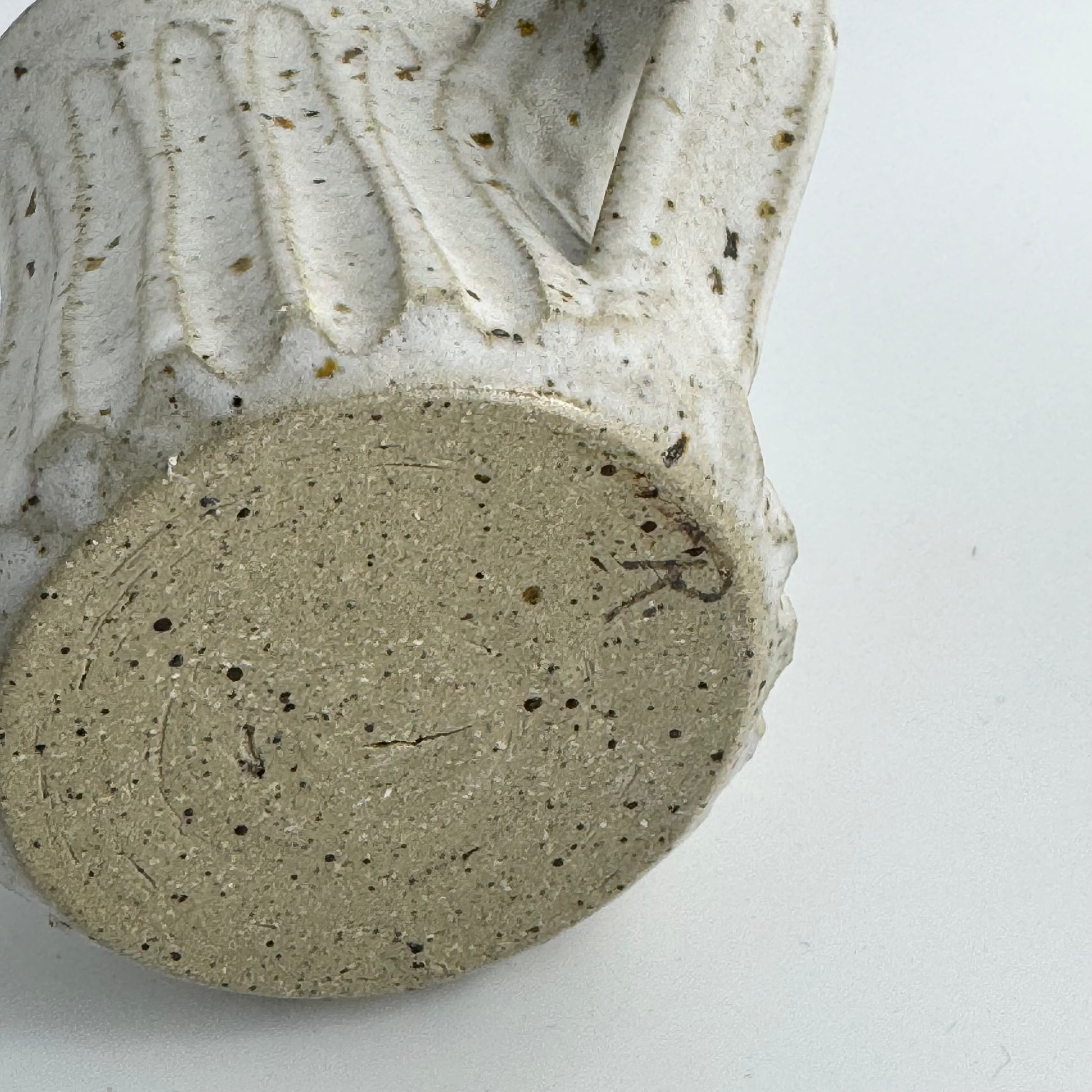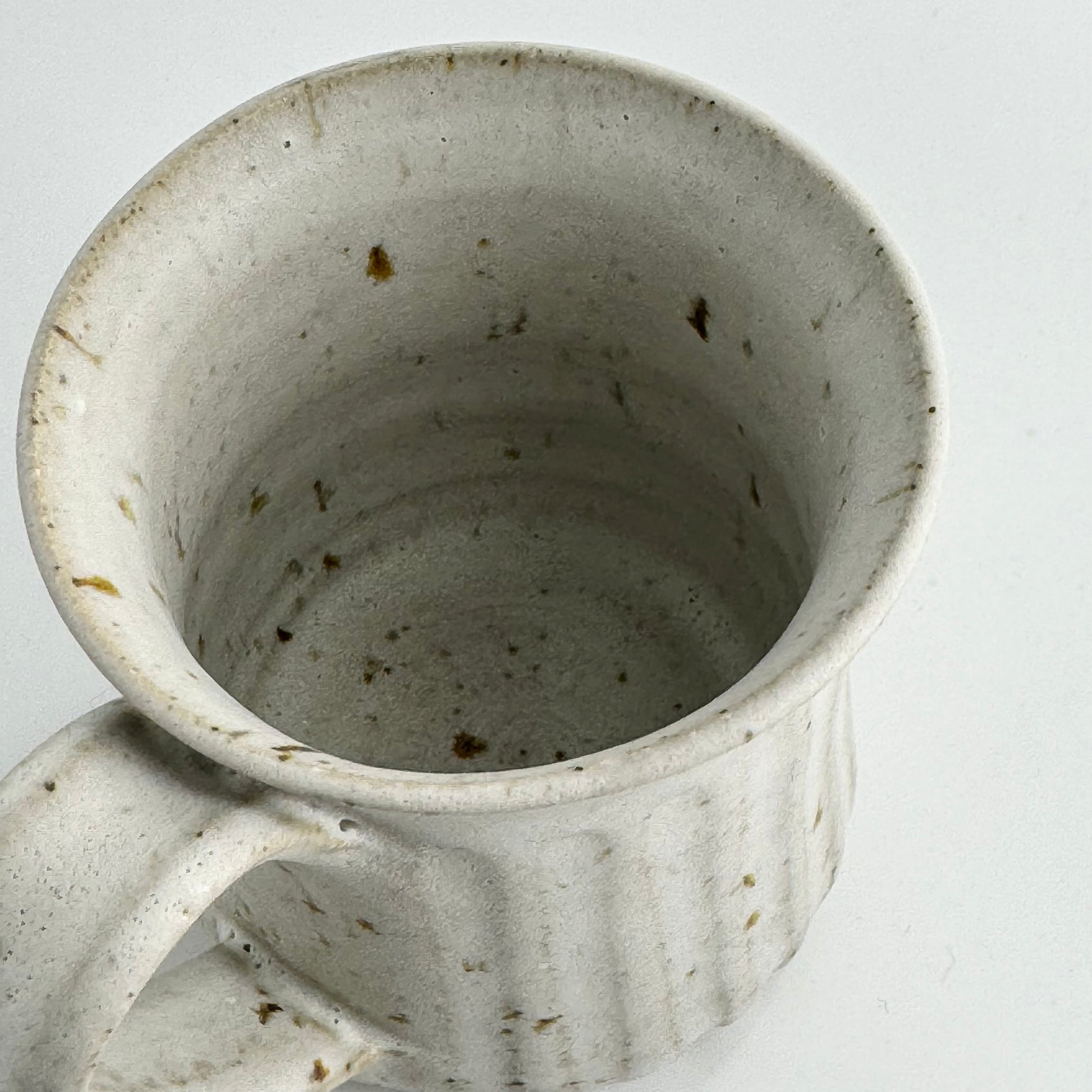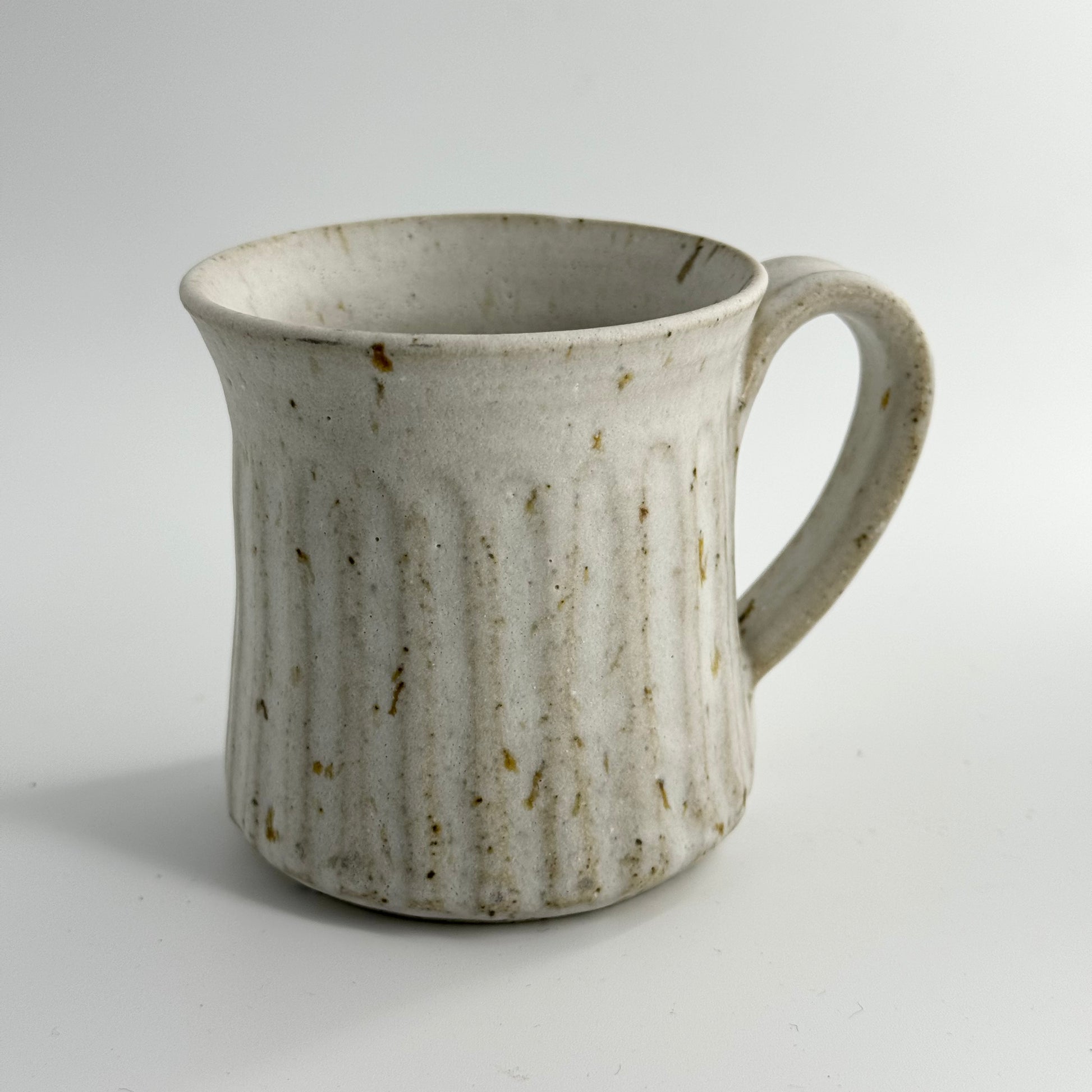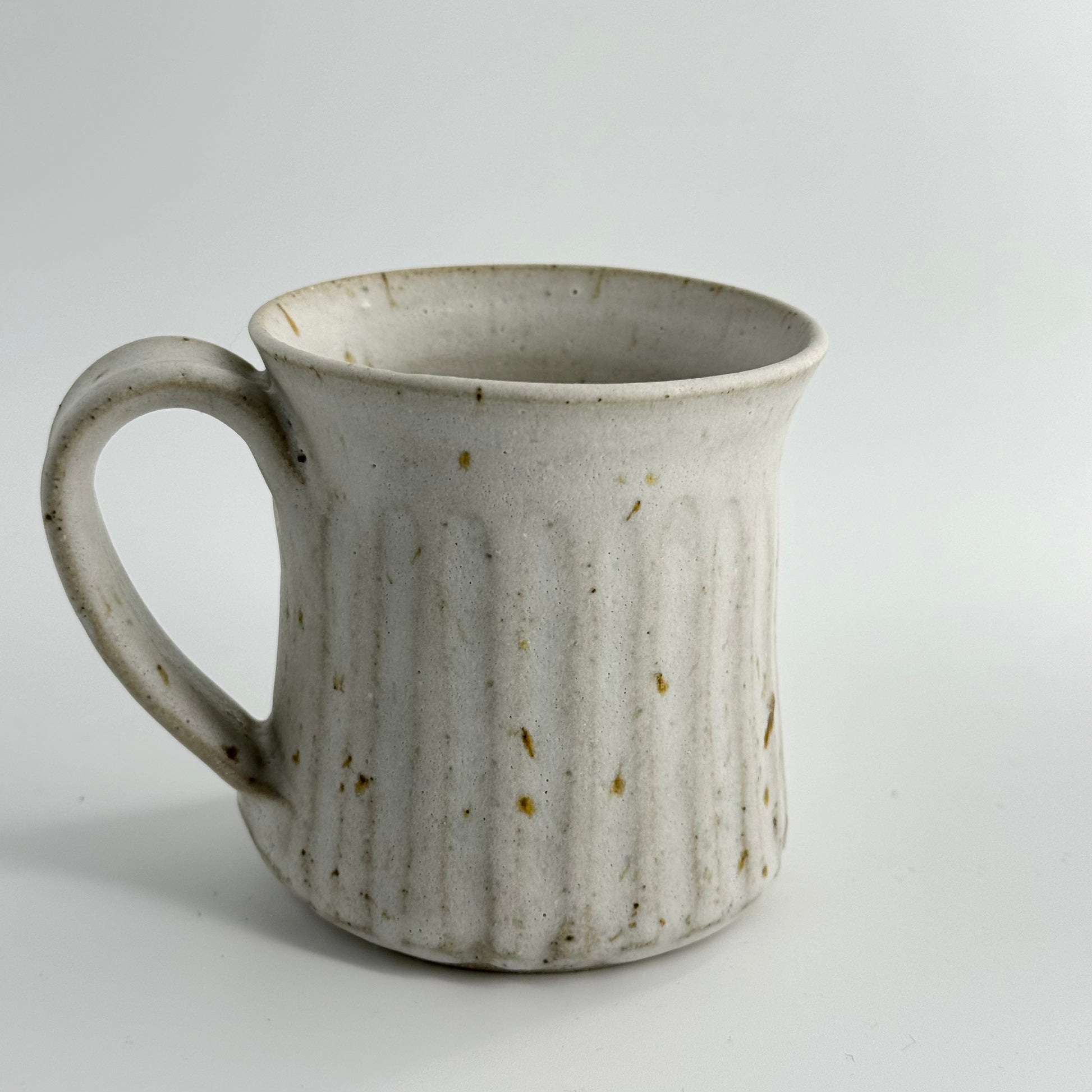 A small-medium sized mug, handmade in Adelaide. Neutral glaze has a matt finish and is speckled with a brown fleck.