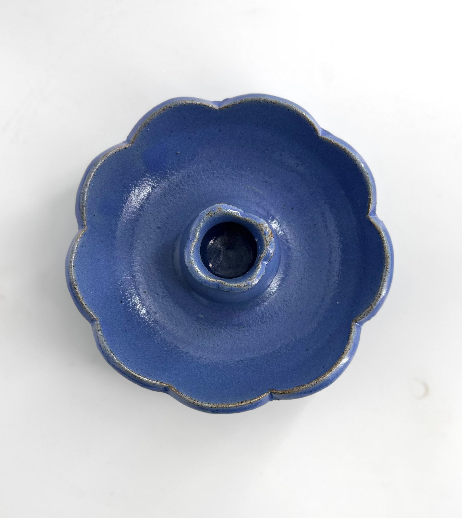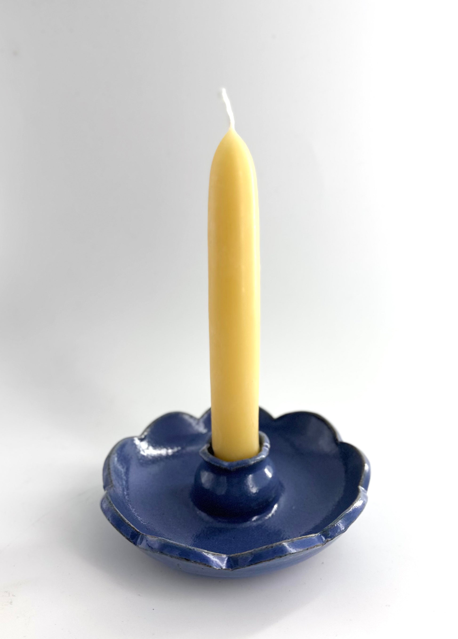 A sweet little scalloped edge candle holder in a glossy mid blue. Holds a standard 21mm tapered candle. Pictured here with our beeswax taper