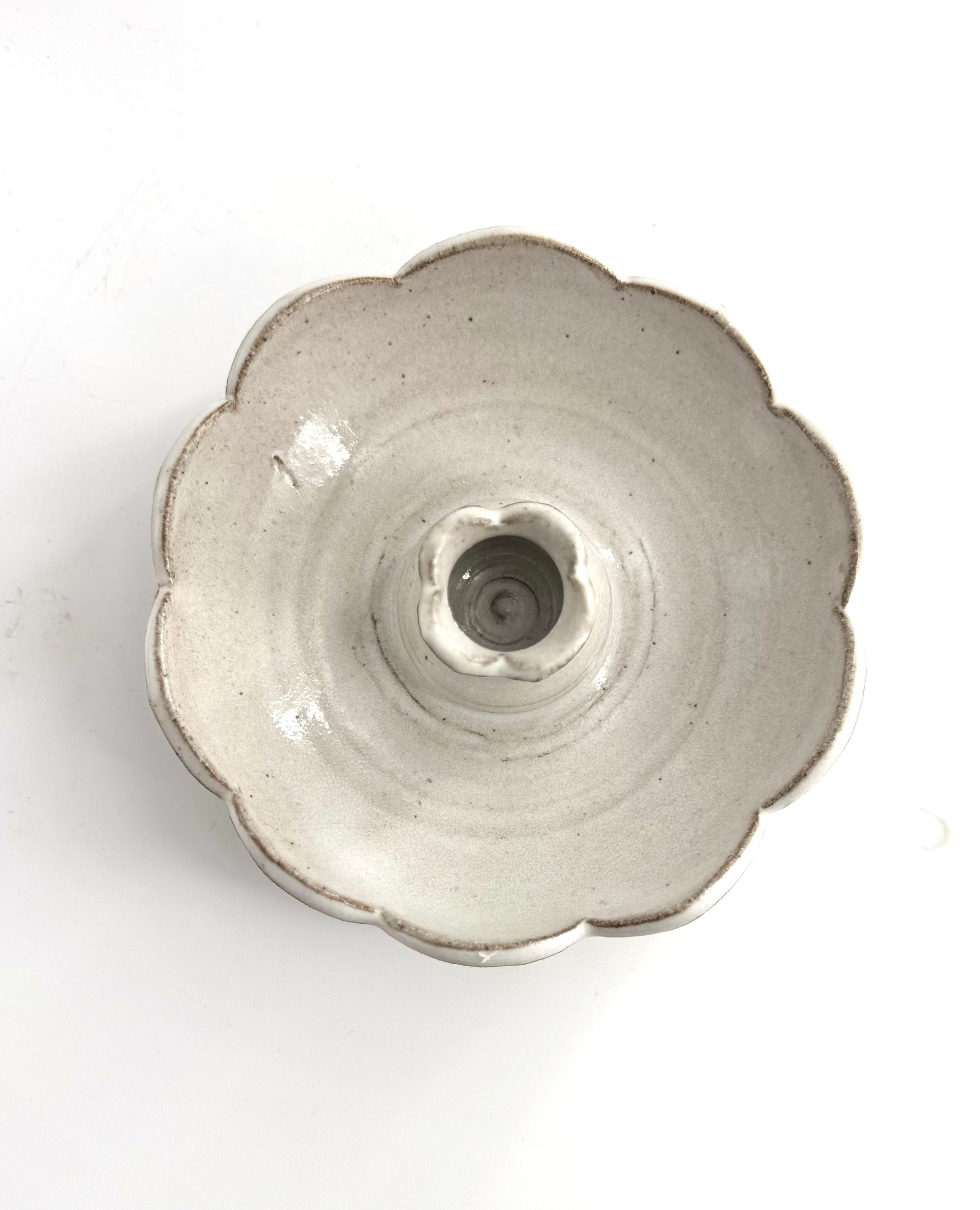 A sweet little scalloped edge candle holder in a rustic white. Holds a standard 21mm tapered candle. Pictured here with our beeswax taper