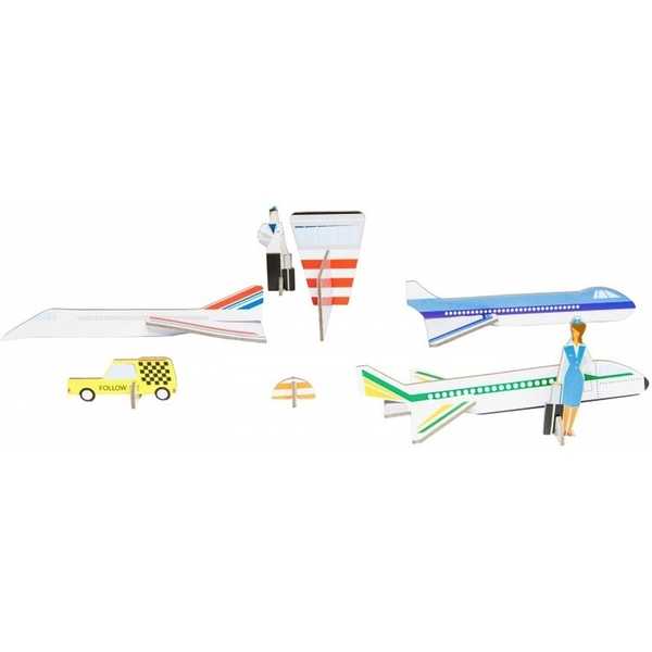 Designed to enhance creativity, featuring unique cardboard architecture to pop-out, build and play with 2D pop up illustrations of an airport with planes, pilots and safety car.