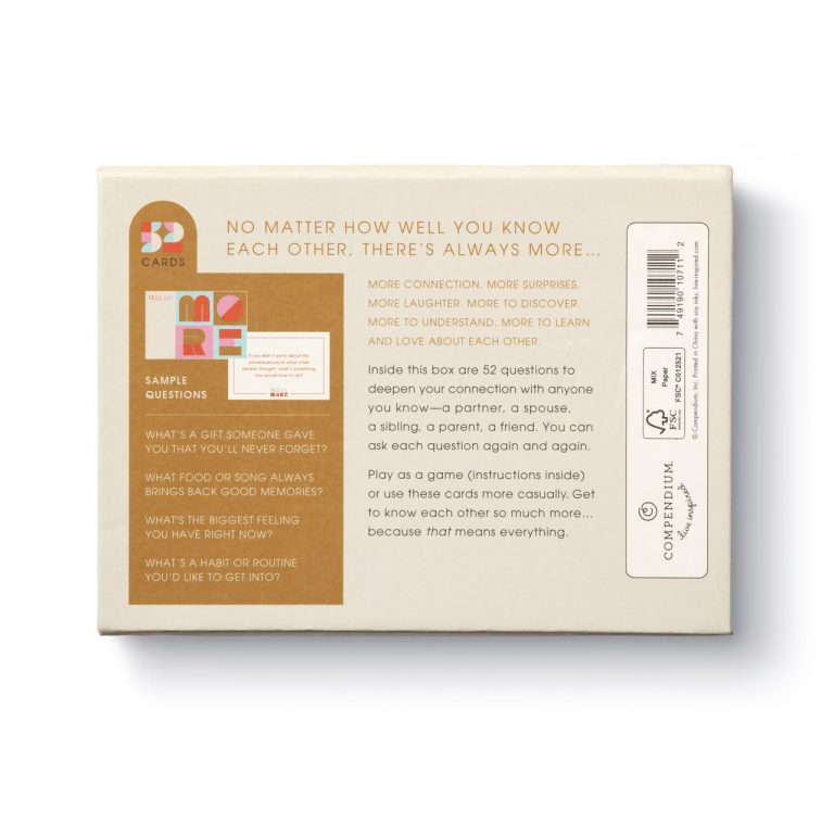 Inside this box are 52 conversation-starter questions to deepen your connection with anyone you know — a partner, spouse, sibling, parent, or friend. You can ask every single one of these questions over and over again to see how your answers change over time.