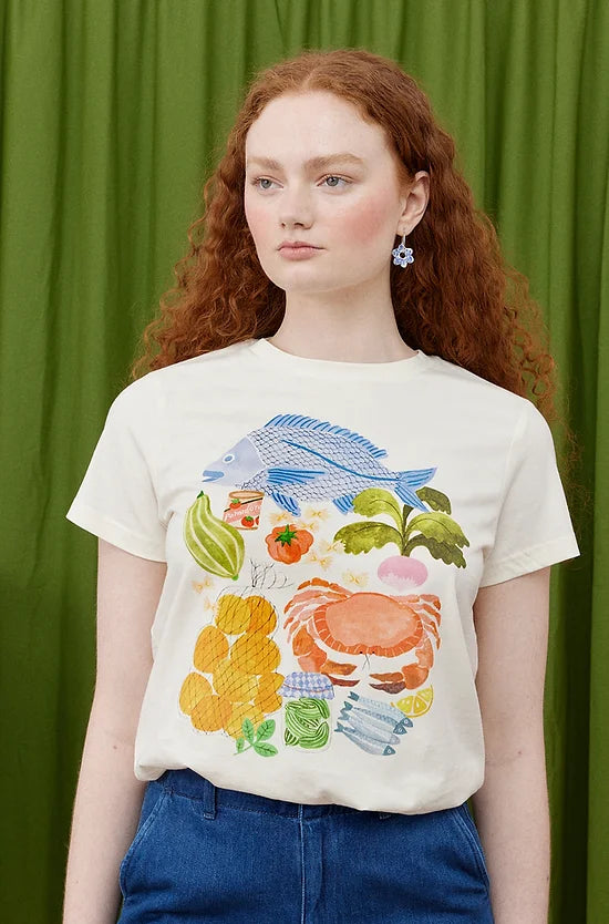 Sunday Market tee shirt captures our signature namesake artwork which features a colourful arrangement of fruits, veggies and more. Digitally printed onto a soft AS Colour Maple tee.