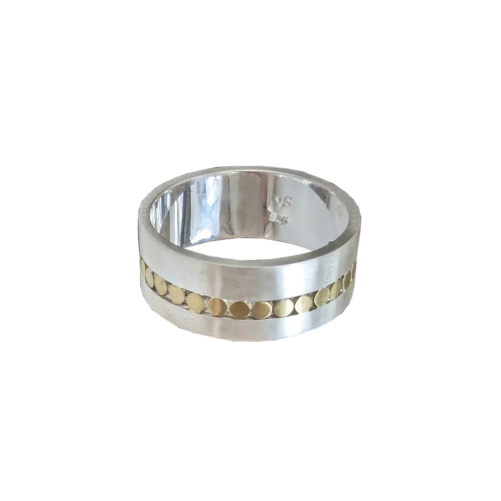 A simple, wide sterling silver band decorated with tiny little dots of brass. How clever are our silversmiths! A striking unisex design.