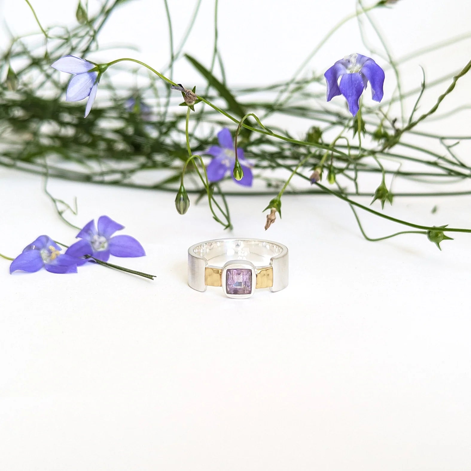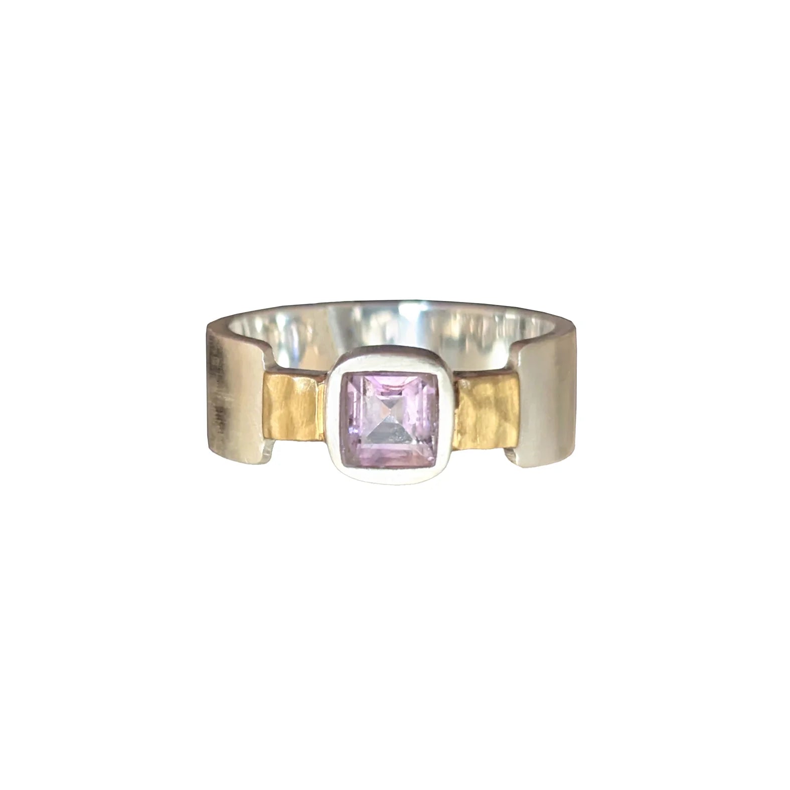 A square Amethyst stone bridged by slightly hammered sterling silver links. This ring has all the attributes of a statement solo ring but also looks stunning stacked on top of the simple Kuad or Kosziousko rings. A wide plain brass band compliments the main front feature.