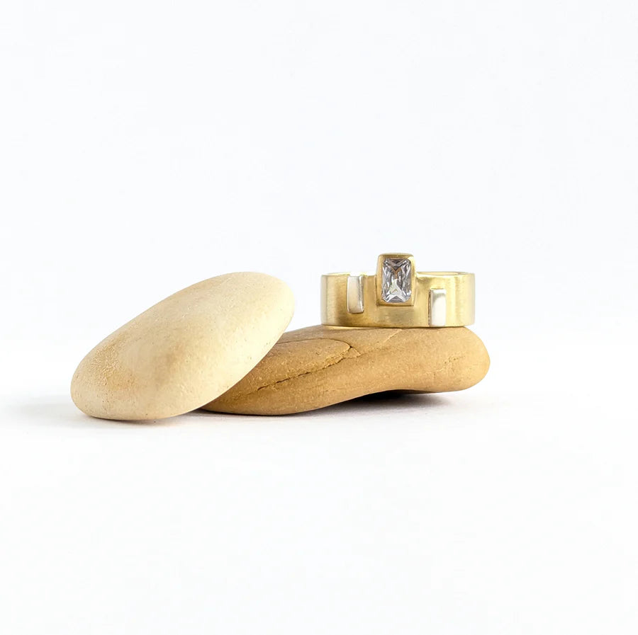 Crisp clear zircon. Wide brass band. And just a touch of sterling.