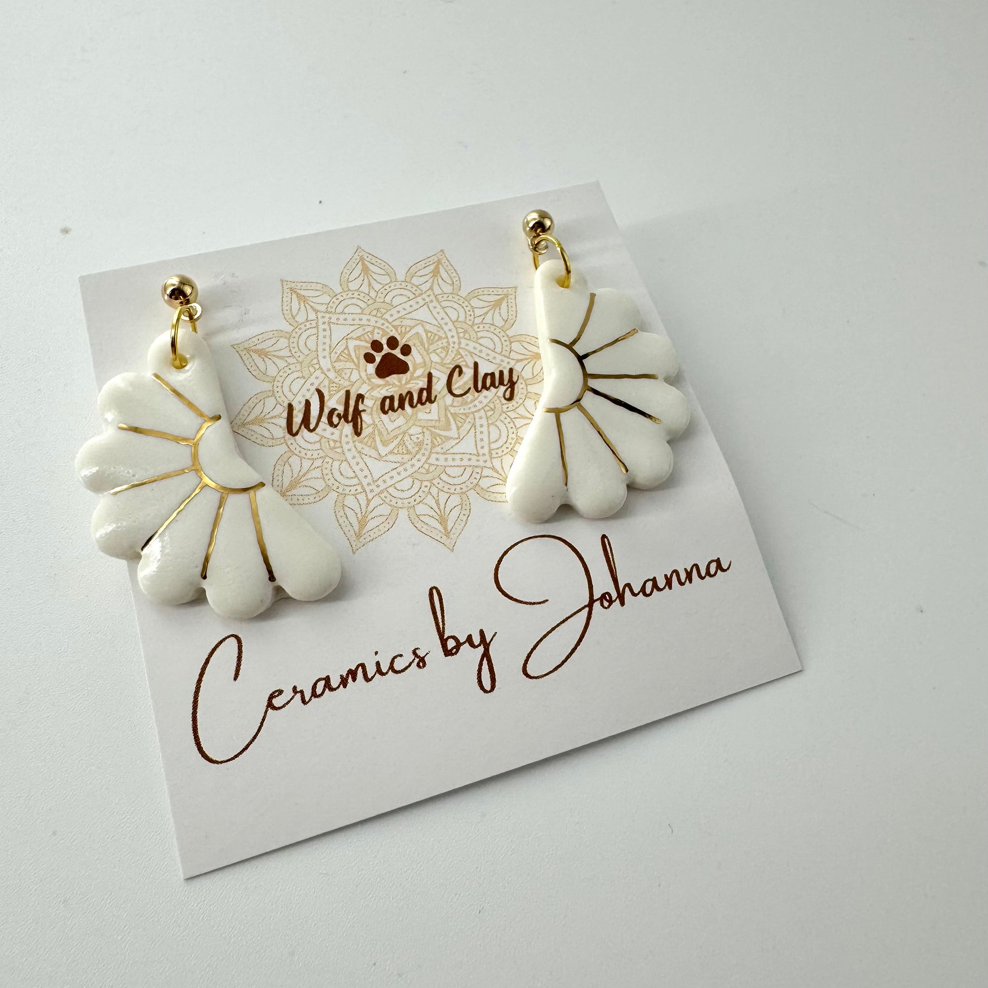 These sweet earrings feature a hand painted daisy design with gold detail. The ceramic piece measures approximately 3.5cm x 2.2cm. Studs are nickel free gold plated.