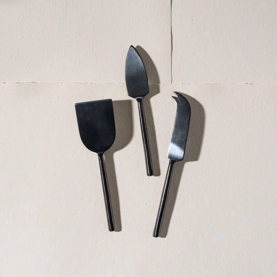 Handcrafted cheese sets made in India. These cheese sets are made from stainless steel with a black PVD coating, they are finished to be dishwasher safe and long lasting.